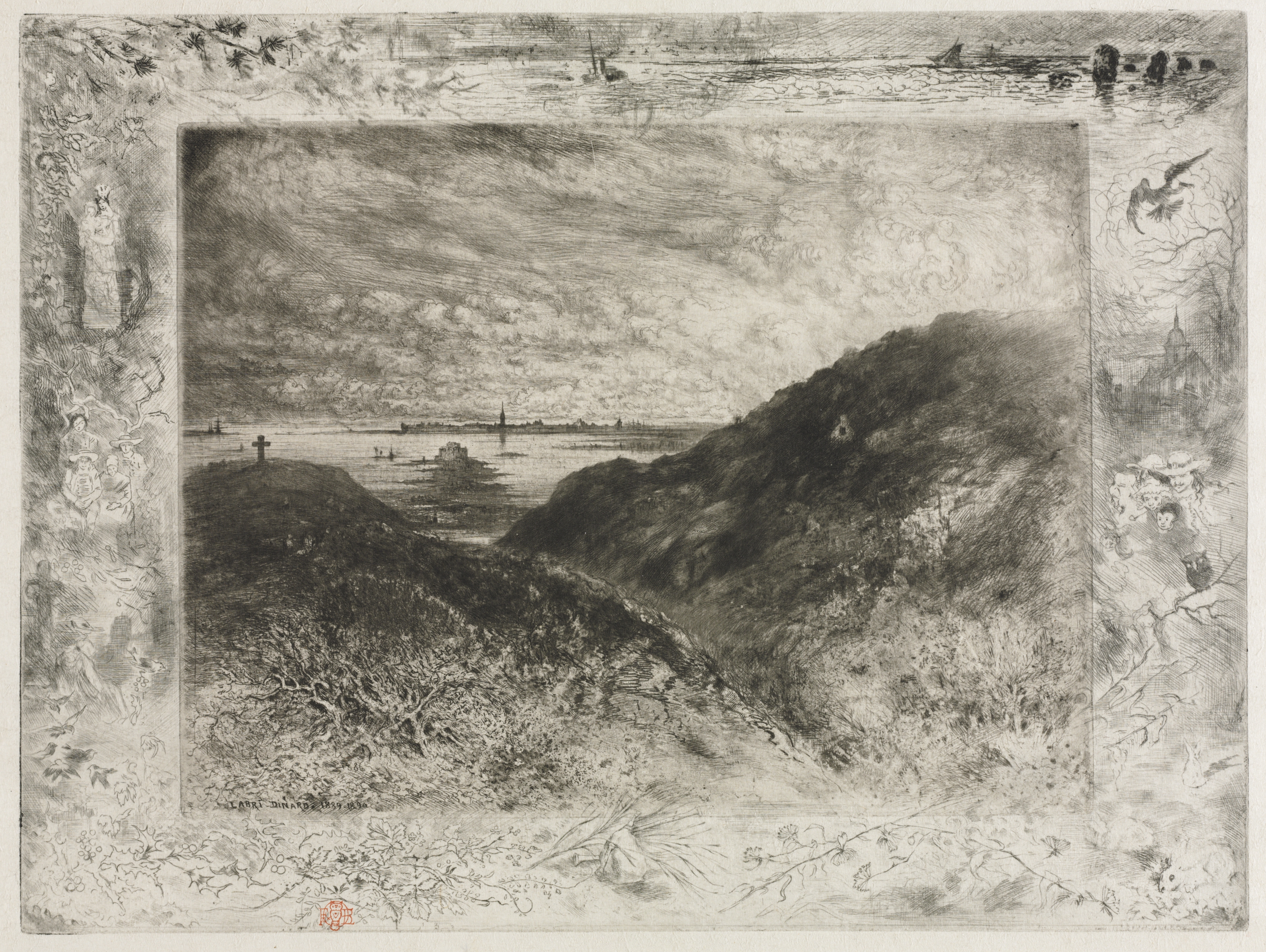 The Cliff, Bay of Saint Malo by Félix Hilaire Buhot. Black and white artwork with a thick off-white border. The border has a floral pattern with people in the left and right sides. The artwork depicts a hill with grass on the right and a cross on top of a smaller hill on the left. There is a body of water with towns and buildings across it. The sky is cloudy with a bird on the top right side. The left and right borders are decorated with etchings of flowers, leaves, people and a bird. The border has a red seal at the bottom left. The entire image has a gray scale.