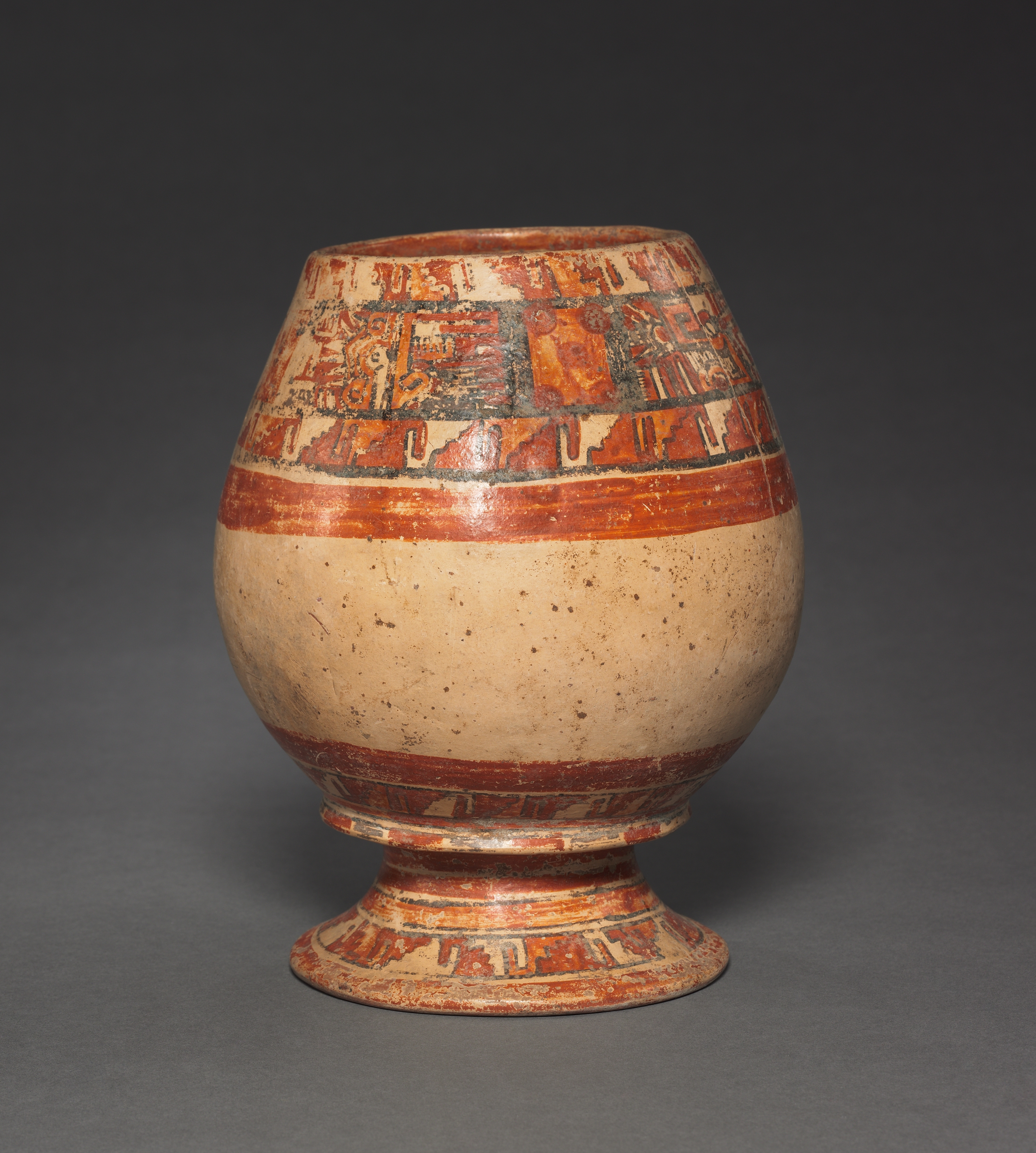 The image depicts the artist's Vase. The vase has a wide mouth and a narrow base. It has a rounded body. The vase's base is wider than its opening. The vase features a predominantly beige base color. The base and top sections are adorned with red and black designs. The top section features geometric patterns. A red stripe encircles the middle of the vase. The background of the image is dark gray. The vase appears to be made of ceramic or clay.