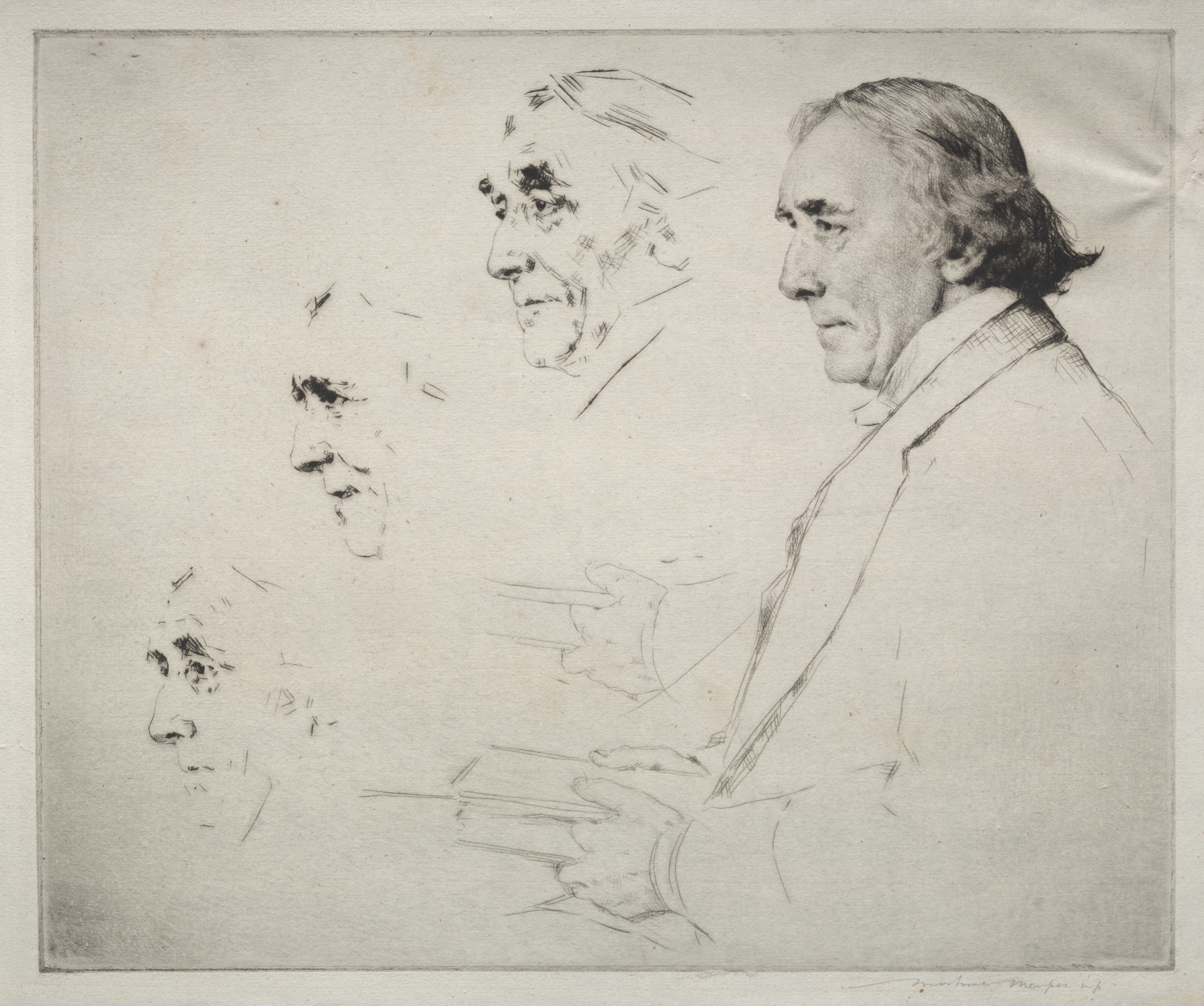 Black and white sketch of a man with medium length hair wearing a suit; the man's profile is drawn facing left; behind and to the left of the man are three fainter profiles of faces drawn in increasing lightness, also facing left; the drawing on the left is the lightest; the background is a textured off-white; the artist's signature is in the bottom right corner. The image depicts Sir Henry Irving by Mortimer Menpes.