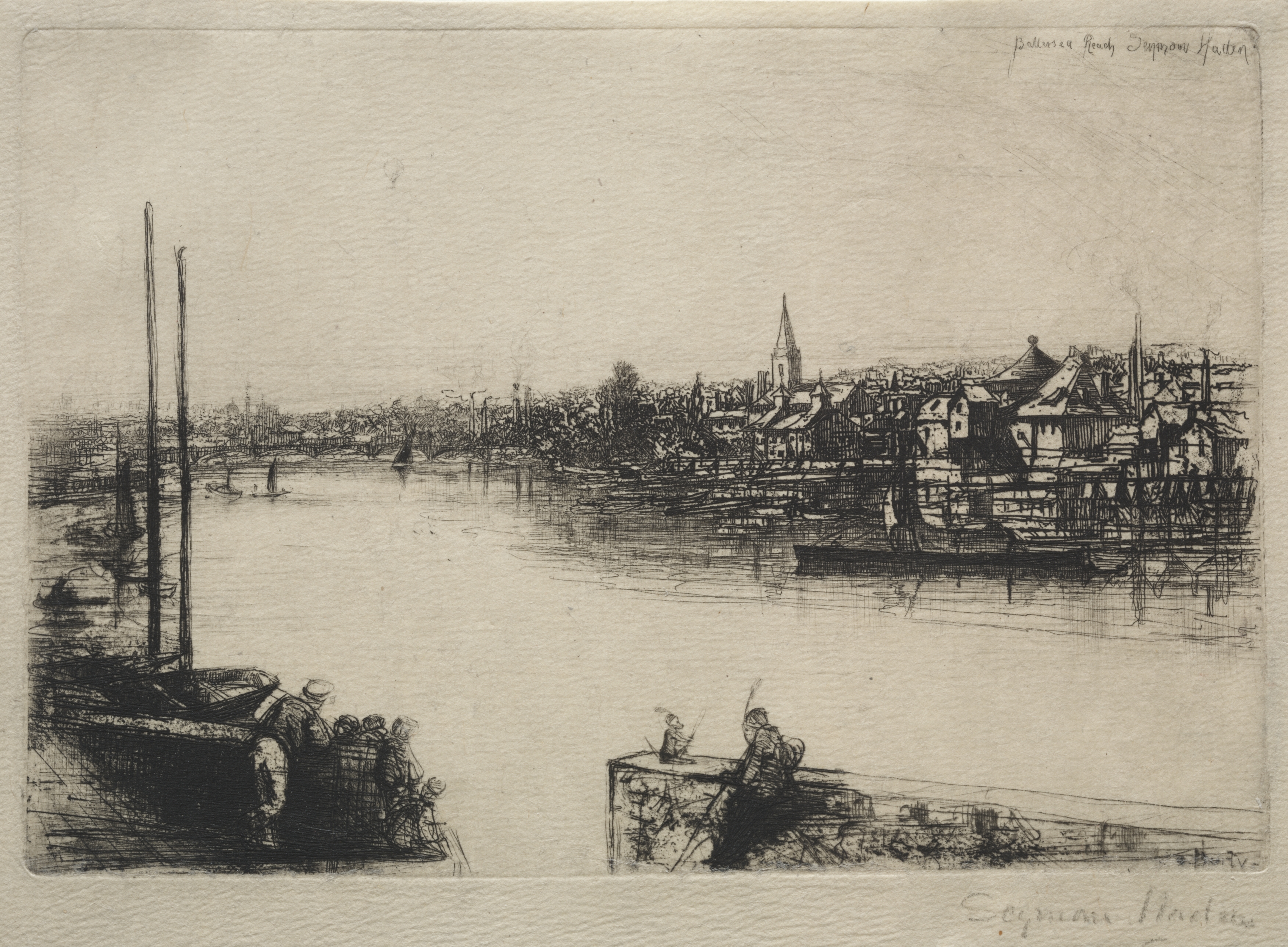 Black and white etching of a river scene. River occupies most of the centre of the image. A concrete wall protrudes into the river from the bottom centre. The riverbank on the right side lined with buildings. A church steeple rises in the distance centre right. Boats on the river. The foreground on the left shows two masts and ropes. The artist's signature appears in the bottom right corner. The title and artist's name appear in the top right corner.