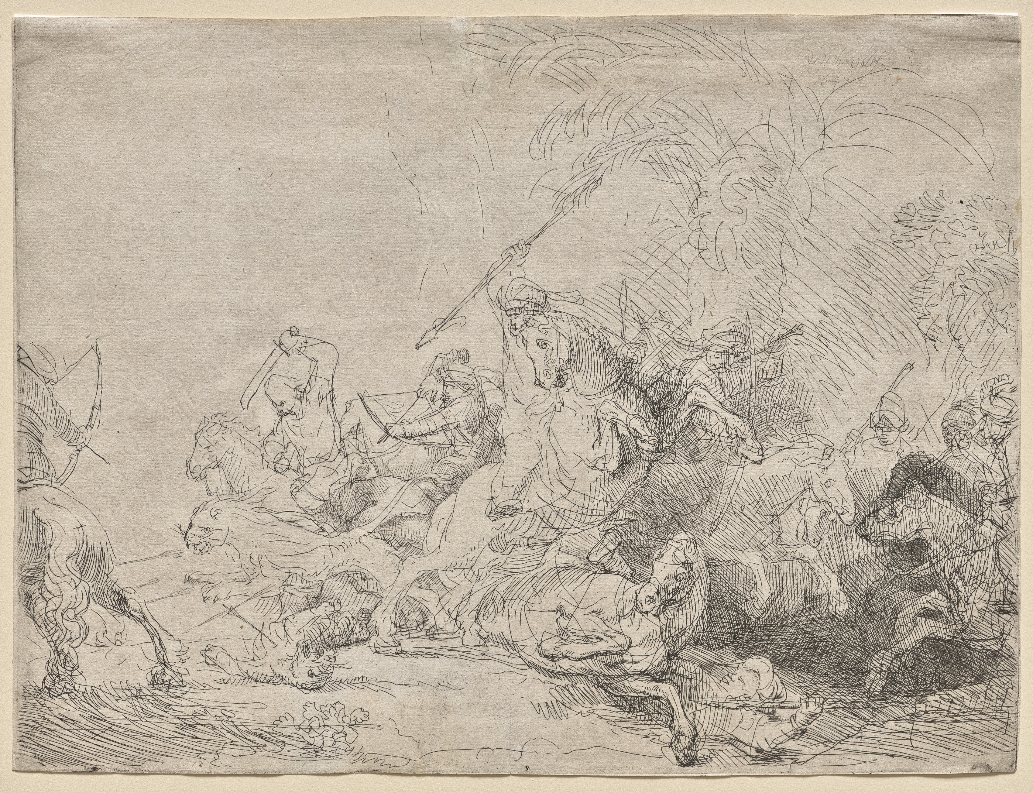 The Large Lion Hunt by Rembrandt van Rijn shows a chaotic scene with several men on horseback hunting a lion. The men wear turbans and hold spears. The horses are rearing up and kicking out. One horse is on the ground, and a lion is on top of it. The lion's mouth is open, and its claws are extended. The men are dressed in loose-fitting clothing. In the background, there are palm-like trees. The drawing is in black and white with heavy lines. The paper is aged and has a yellowish border around it. The image is dense with motion lines. The scene is dynamic and violent. The style is highly detailed and expressive.