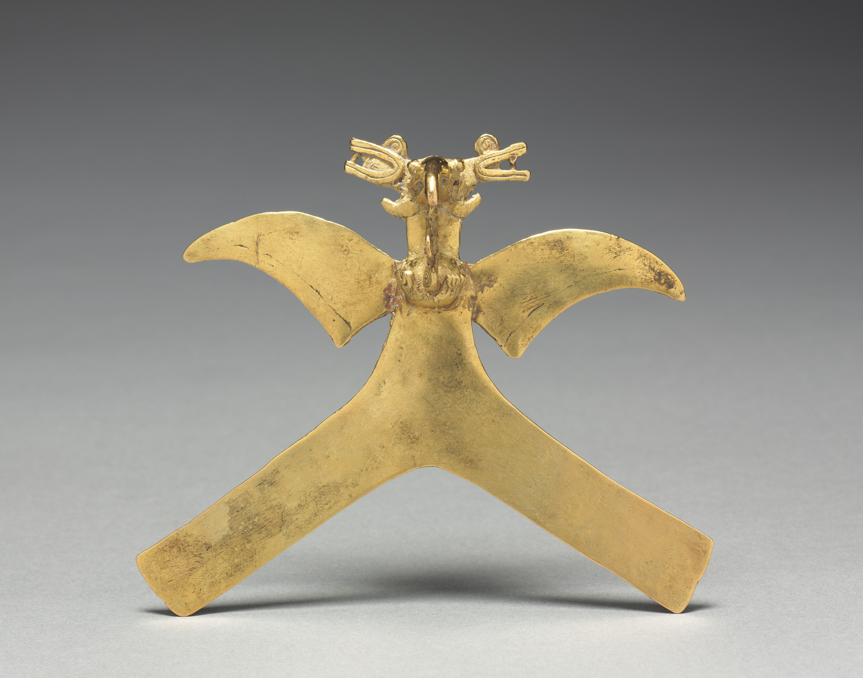 The Bird Pendant by Sinu is a gold artifact. It features a bird with a long body that has a wide Y-shaped base and two large curved wings on either side. The bird's head is small with a beak and two small decorative spiral shapes on top resembling eyes or ears. The background of the image is grey.
