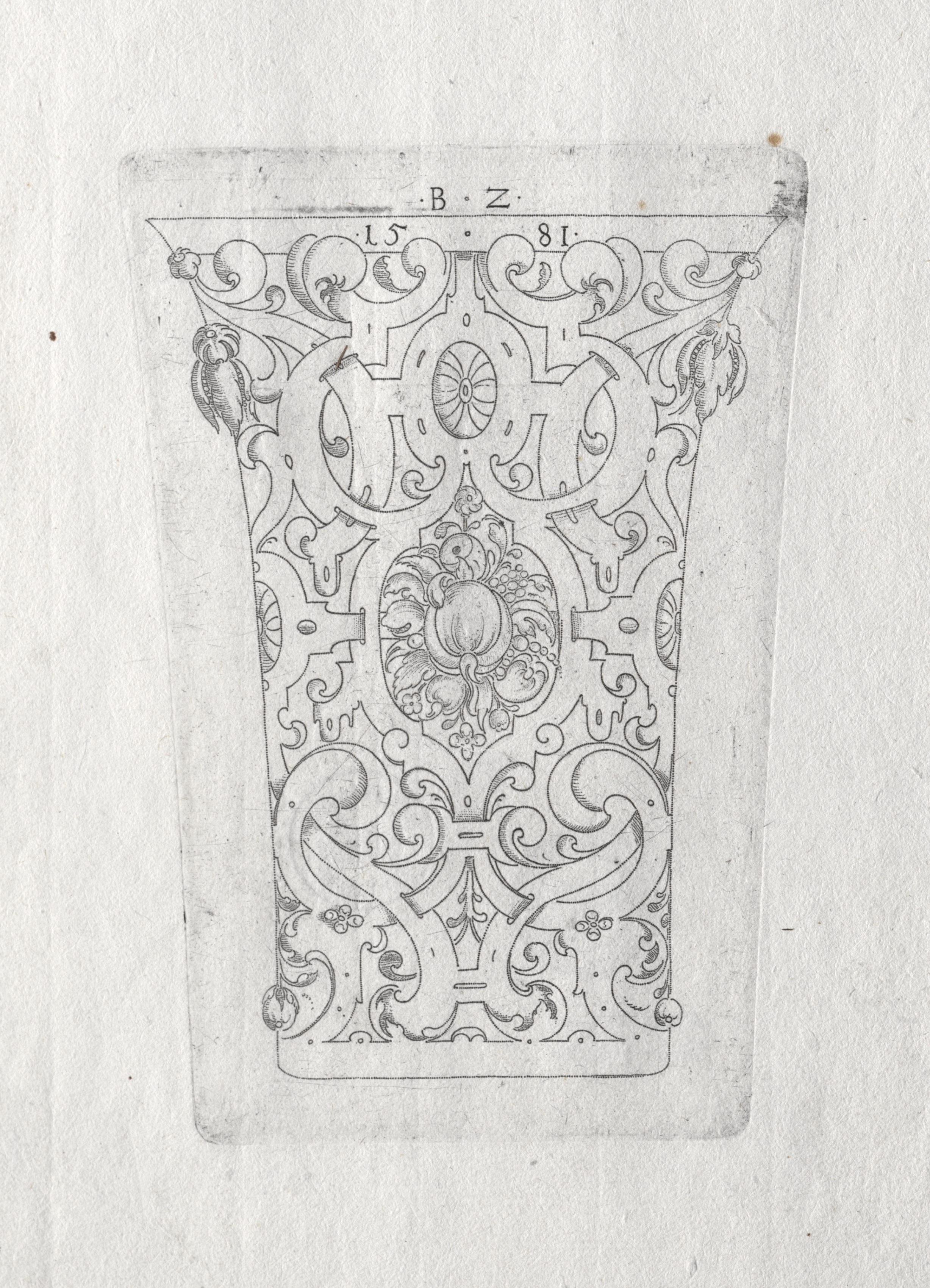 Rectangular drawing with rounded corners on off-white paper. The drawing depicts an ornate design resembling a beaker. The top of the beaker is wide and flat with a slight lip; it tapers down to a narrower base. The design features intricate scrollwork, floral motifs, and curvilinear shapes. At the top center of the beaker design are the letters "B Z" with numbers "15" and "81" on either side. The image appears to be a black and white line drawing or engraving. The ornate beaker design is likely an example of ornamental or decorative art from an unknown period.