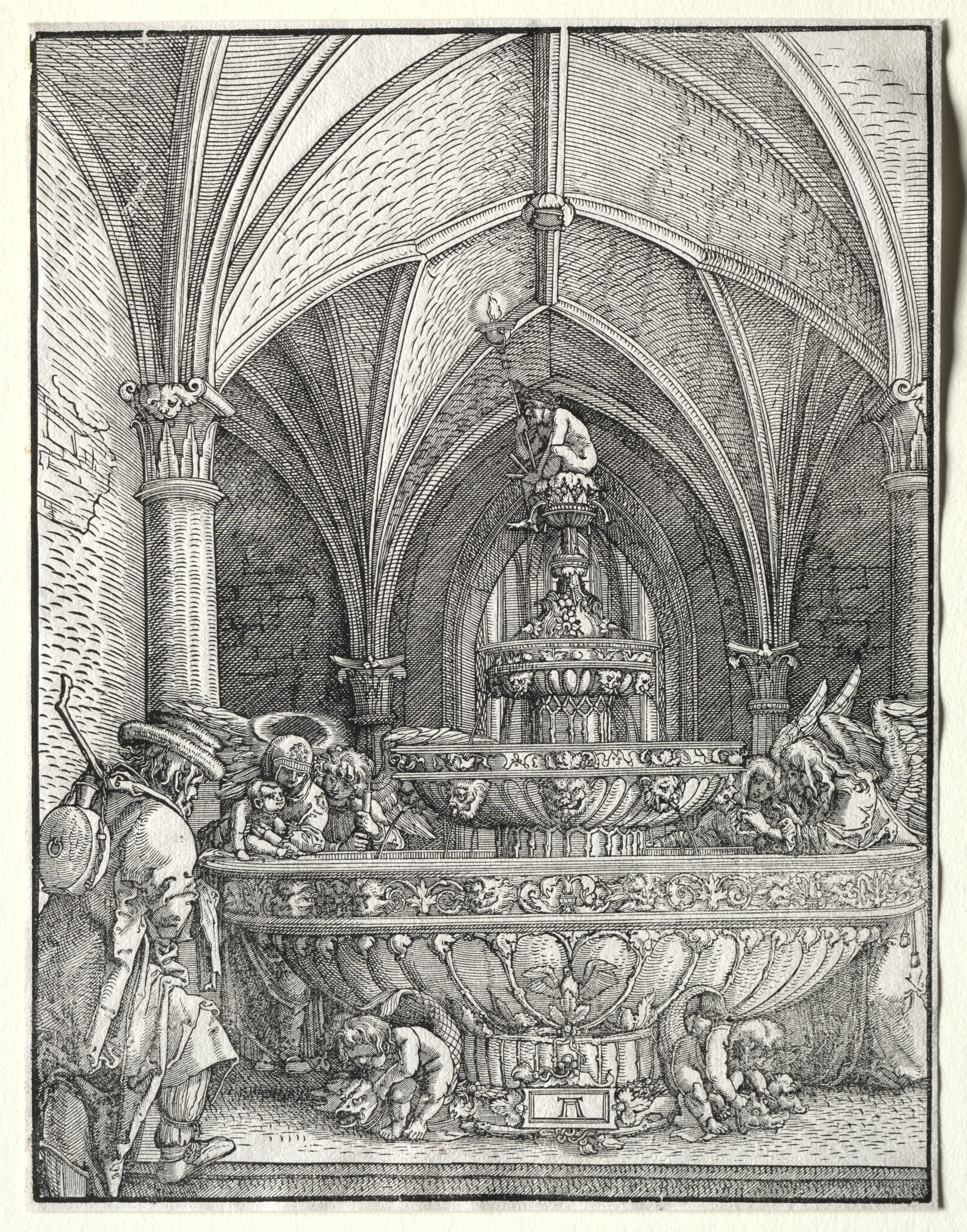 Black and white image. Square image. The Holy Family; a man, a woman, and a small child. Woman wearing a long dress and holding the child. The man wearing a hat and a long robe. All three are standing next to a large ornate fountain. The child on the left side sitting on a ledge. The man looking down. Woman looking to the right. The fountain has water coming out the top. The fountain has a decorative base. The base has cherubs on it. The background shows an arched ceiling. The arches supported by columns. There are cherubs on top of the columns. There are decorative carvings on the walls. The floor is tiled.
