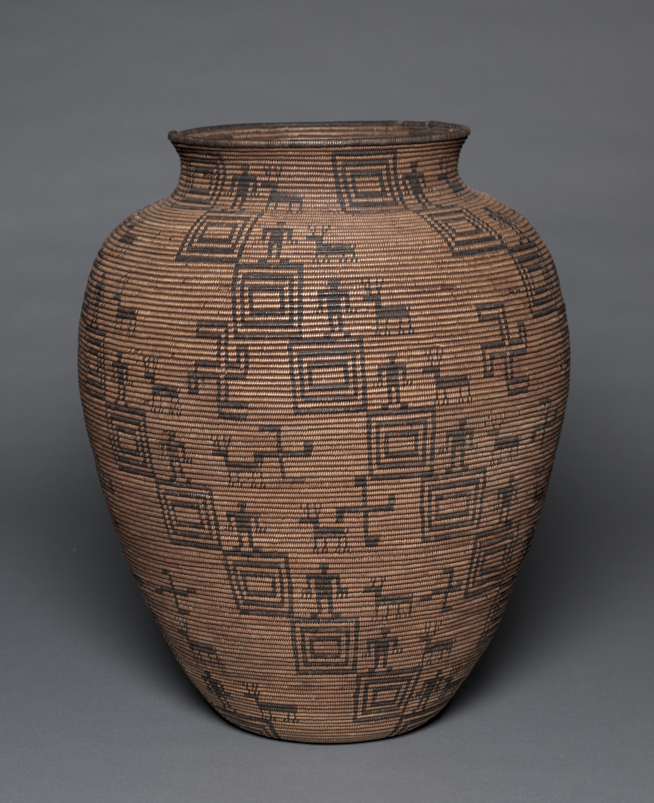 The image shows a large, brown vase with a wide mouth and a narrow base. The vase is made of woven material, possibly clay or basket-weaving techniques, and features a pattern of dark brown lines and shapes on its surface. The vase has a rounded body that tapers slightly towards the top, with a wide mouth and a small lip around the rim. The background of the image is a solid gray color. The title of the piece is "Olla", an artist's name is not provided.
