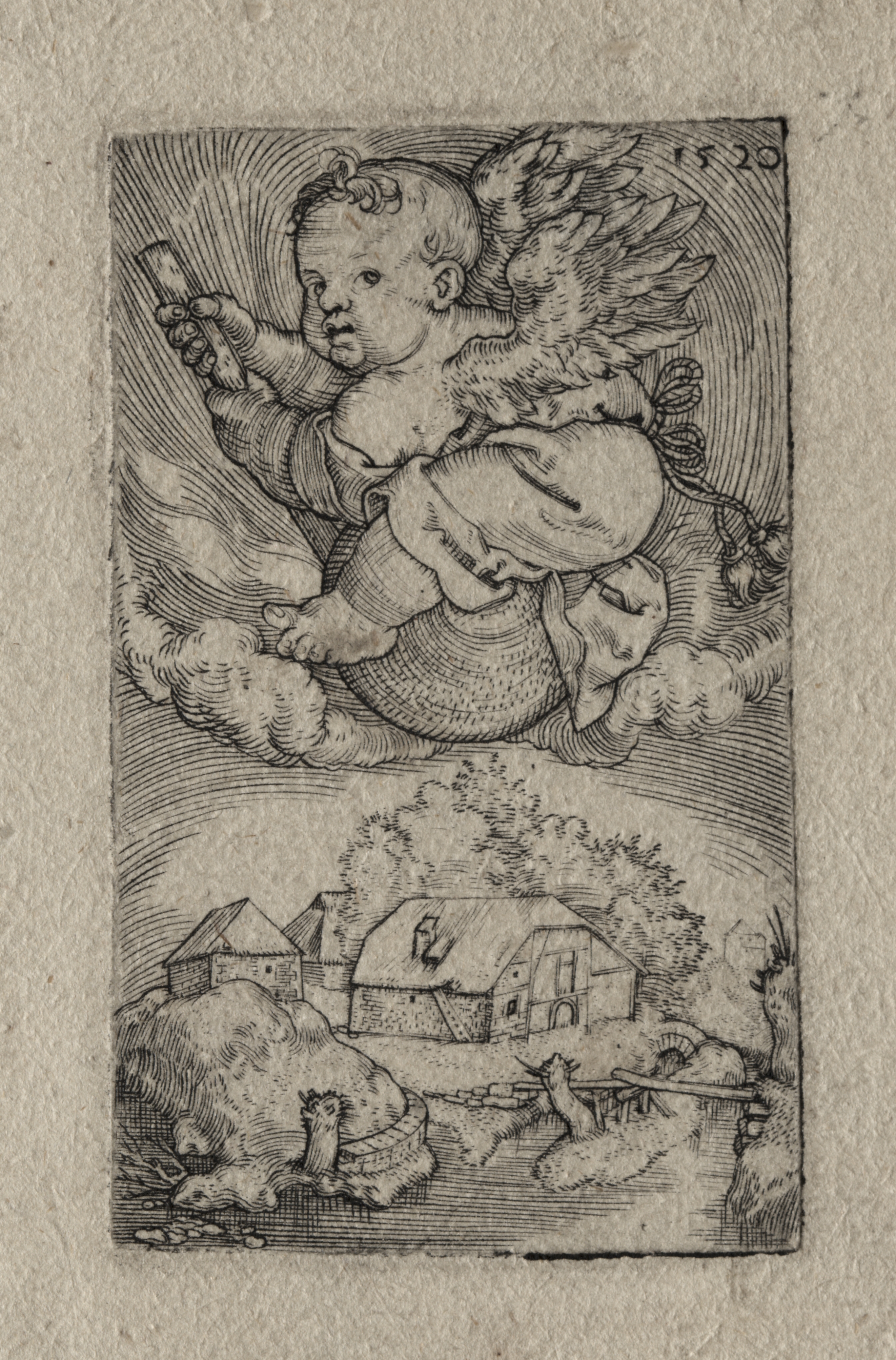The image shows a black-and-white etching titled 'Genius Riding on a Ball' by Barthel Beham. The composition is divided into two main parts: the top section features a cherub riding on a ball, and the bottom section depicts a landscape. The cherub is positioned at the top, centered, with wings spread out and holding a cylindrical object. The cherub has curly hair and appears to be sitting on a sphere or ball. The bottom section shows a detailed landscape with buildings, trees, and a body of water. A figure is seen in the water. The background of the image is textured, resembling paper.