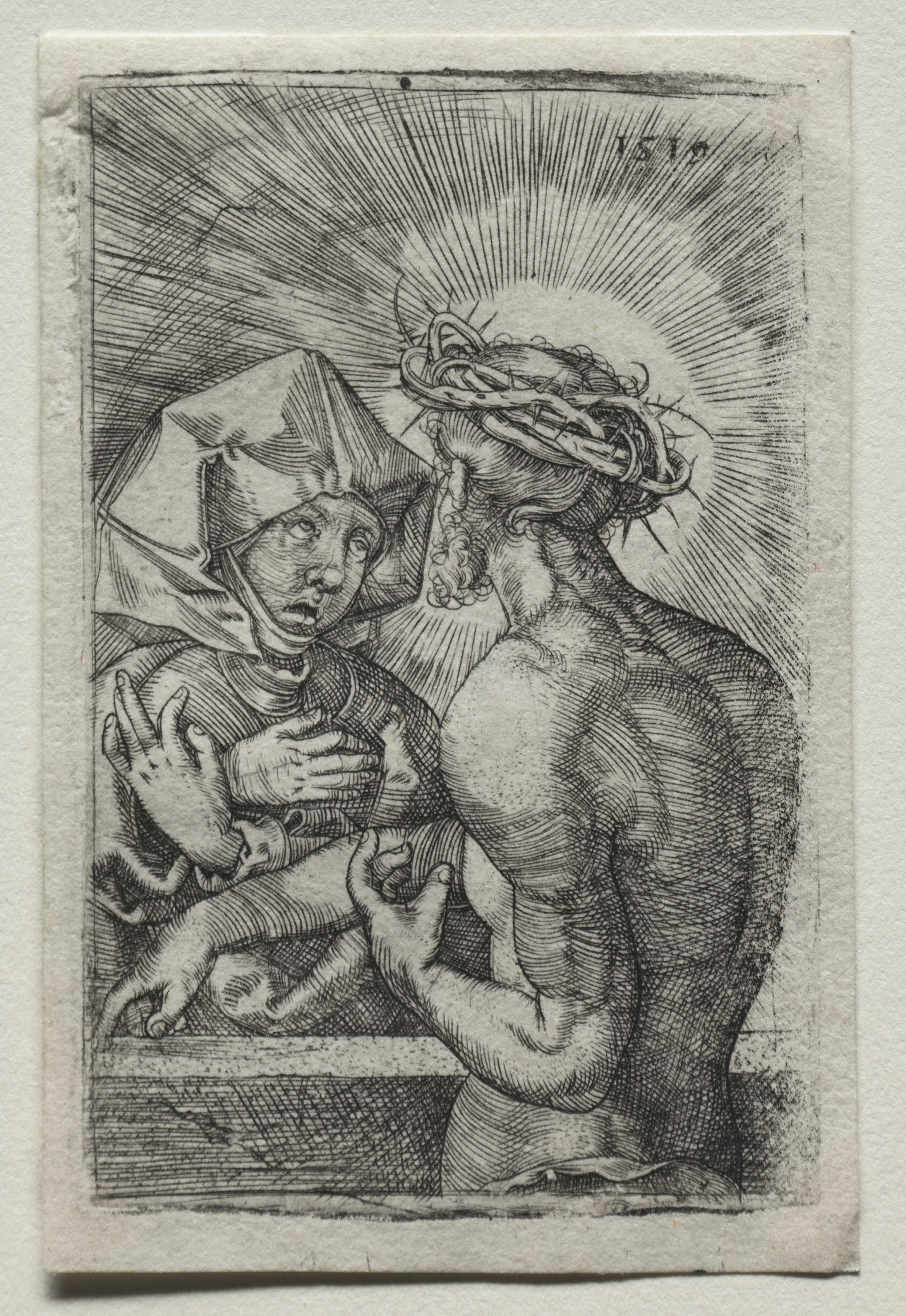 The image depicts a black and white drawing of two people. The man on the right is shirtless with a crown of thorns on his head. A halo-like pattern of lines radiates from behind his head. The woman on the left wears a head covering and a dress. She appears to be touching the man's chest. The man touches her hand. The background of the drawing is shaded. The drawing is on a rectangular piece of paper with rough edges. It appears to be against a light-colored background. The image is titled "Christ and the Virgin" by Hans Sebald Beham.