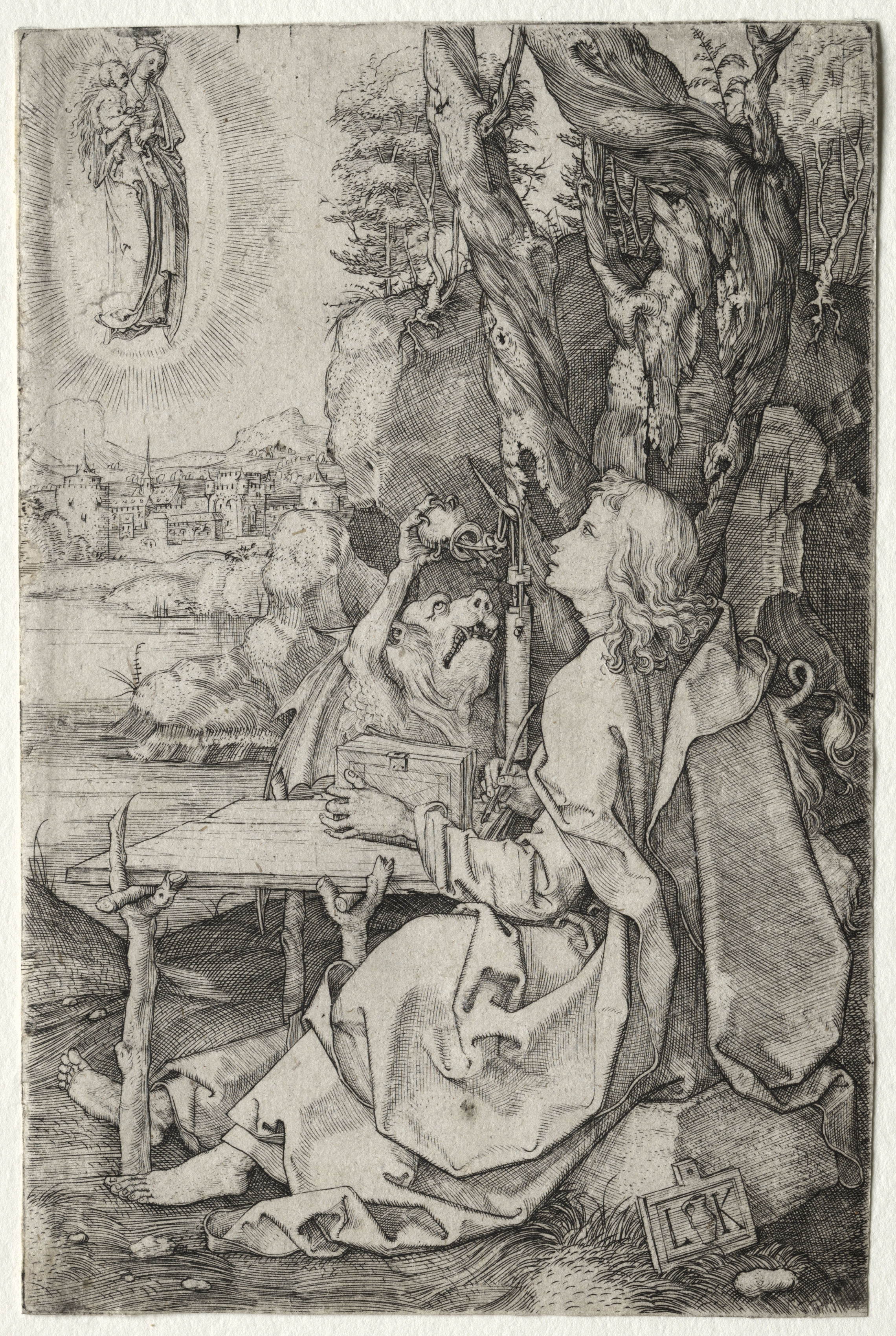 The image depicts a man sitting on the ground in front of a tree. The man has long wavy hair and wears a long robe. He sits with his back to the right, looking up to the upper left. He holds a quill in one hand and a piece of paper on a writing desk in the other. A box with letters "LK" is on the ground next to him. A town on the water is visible on the left. An angel appears in a radiant circle above. The artist's work is signed with an "L" and a "K".