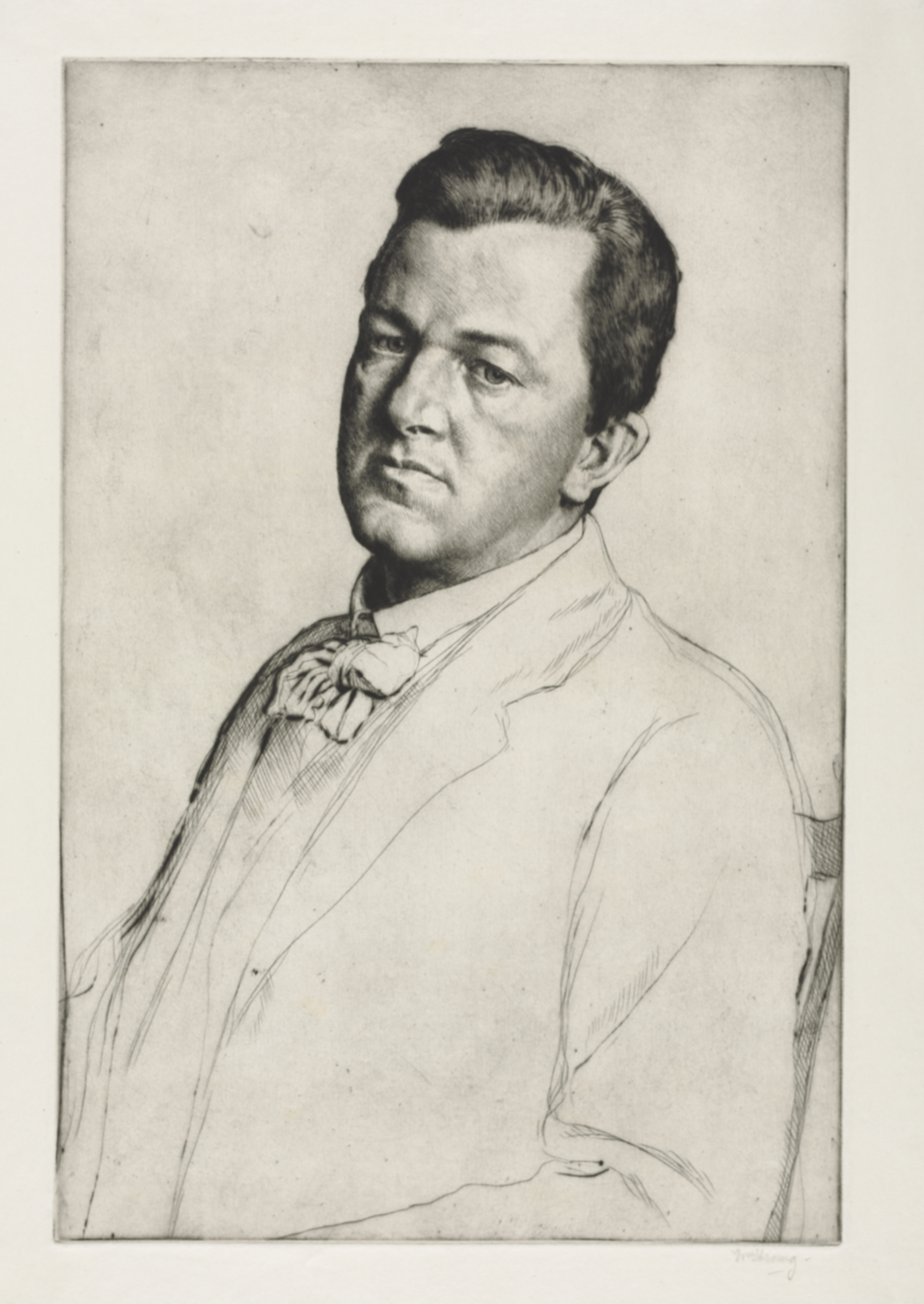 Black and white portrait drawing of a man with short dark hair, wearing a light-colored suit jacket, white collared shirt, and bow tie. The man is seated and viewed from the front with his body angled slightly to his right and his head turned towards the viewer. His facial features include dark eyes and eyebrows, a nose, and a mouth. He sits on a chair with a visible backrest on the right side. The drawing has a light-colored background. The artist's signature is visible in the bottom-right corner. The title of the work is "Sir Charles Holroyd" and the artist is "William Strang".