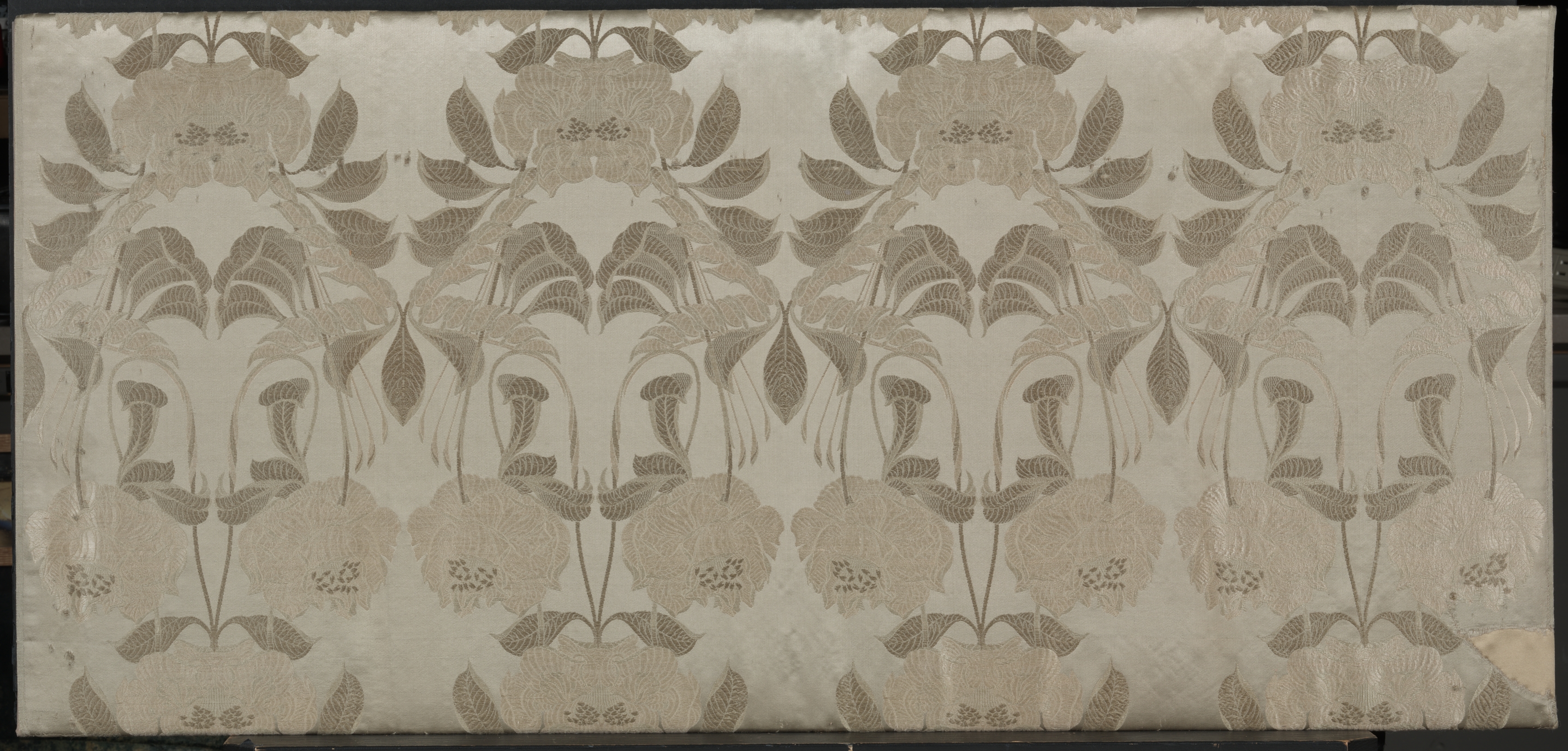 Textile fragment with repeating pattern of chrysanthemums and peonies in floral arabesque