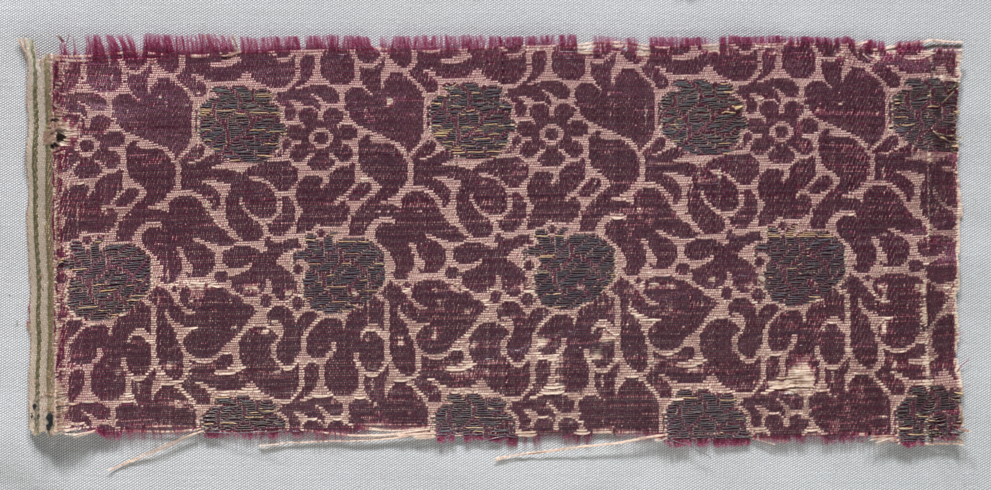 The Brocaded Textile Fragment by artist shows a rectangular piece of fabric with frayed edges. The fabric has a maroon background with a light pink floral pattern. Dark green squares are woven into the fabric, arranged in a grid-like pattern. The squares have a subtle gold sheen. The fabric appears to be made of silk or another luxurious material. The background behind the fabric is light gray.
