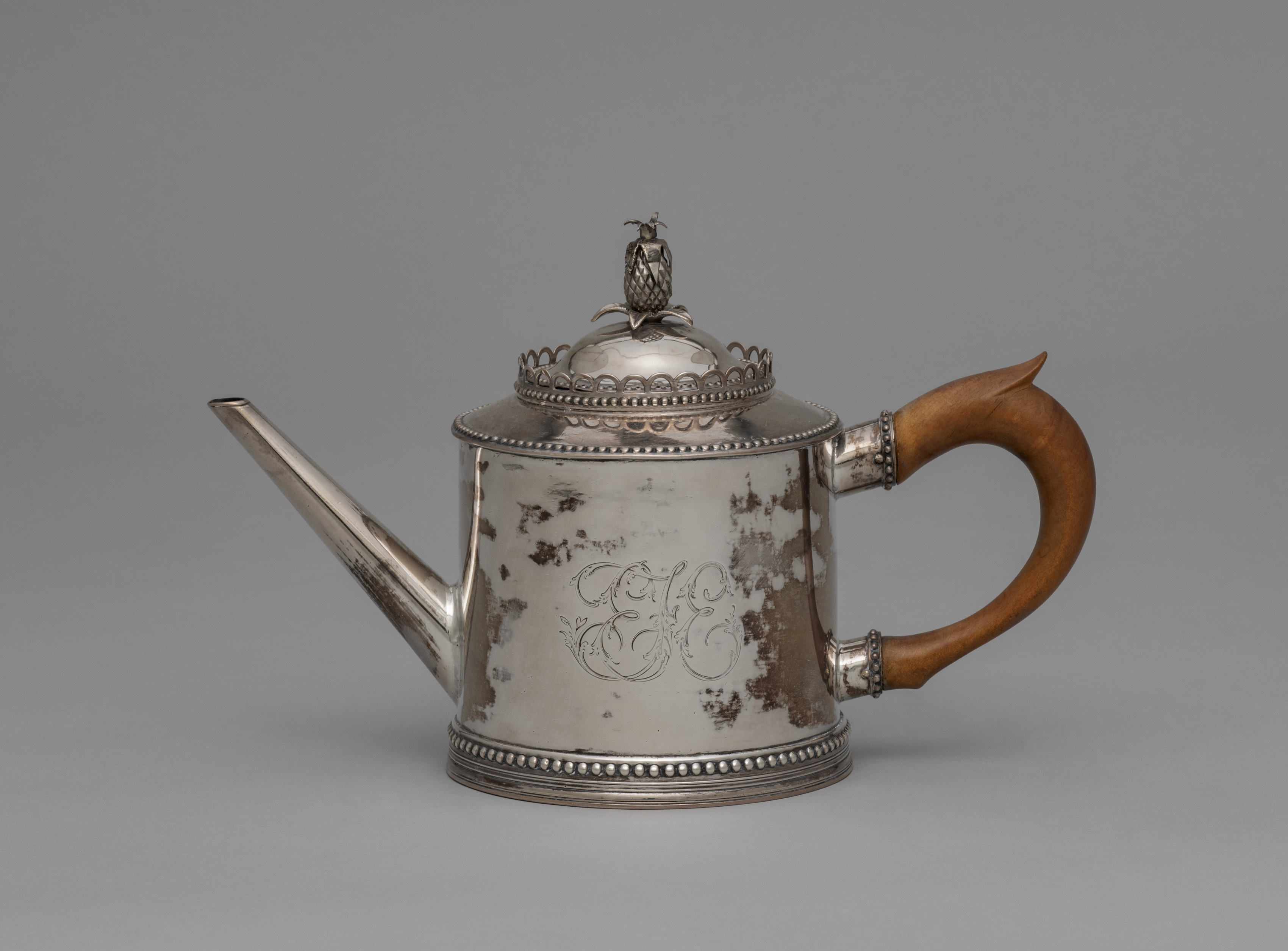 Silver teapot with wooden handle. Teapot body is cylindrical with a beaded base and a long, narrow spout. A monogram engraved on the front. The lid has a decorative edge and a small finial on top. The handle is curved and made of wood. The teapot appears to have some tarnish spots. The background is a plain gray color. The title of the teapot is "Teapot" by John David.