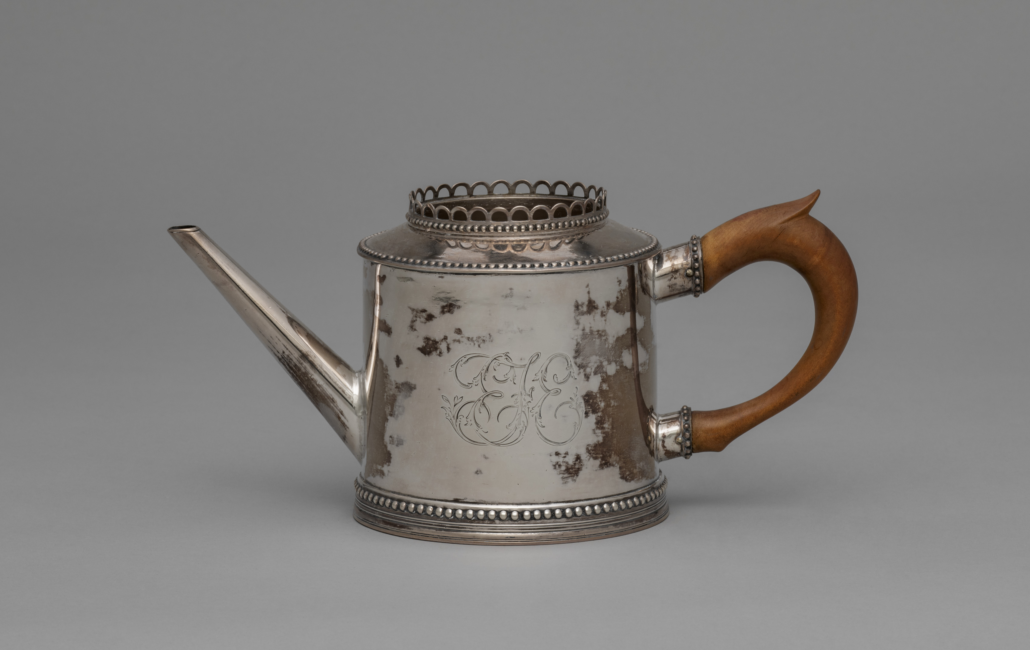 The teapot by John David is made of silver-colored metal with a brown wooden handle. The teapot has a long spout on the left side and a curved handle on the right side. The handle features two metal bands around it where it meets the teapot. A decorative edge runs along the top and bottom of the teapot. The lid has a scalloped edge. The teapot has an etched monogram on the front. The background is gray.