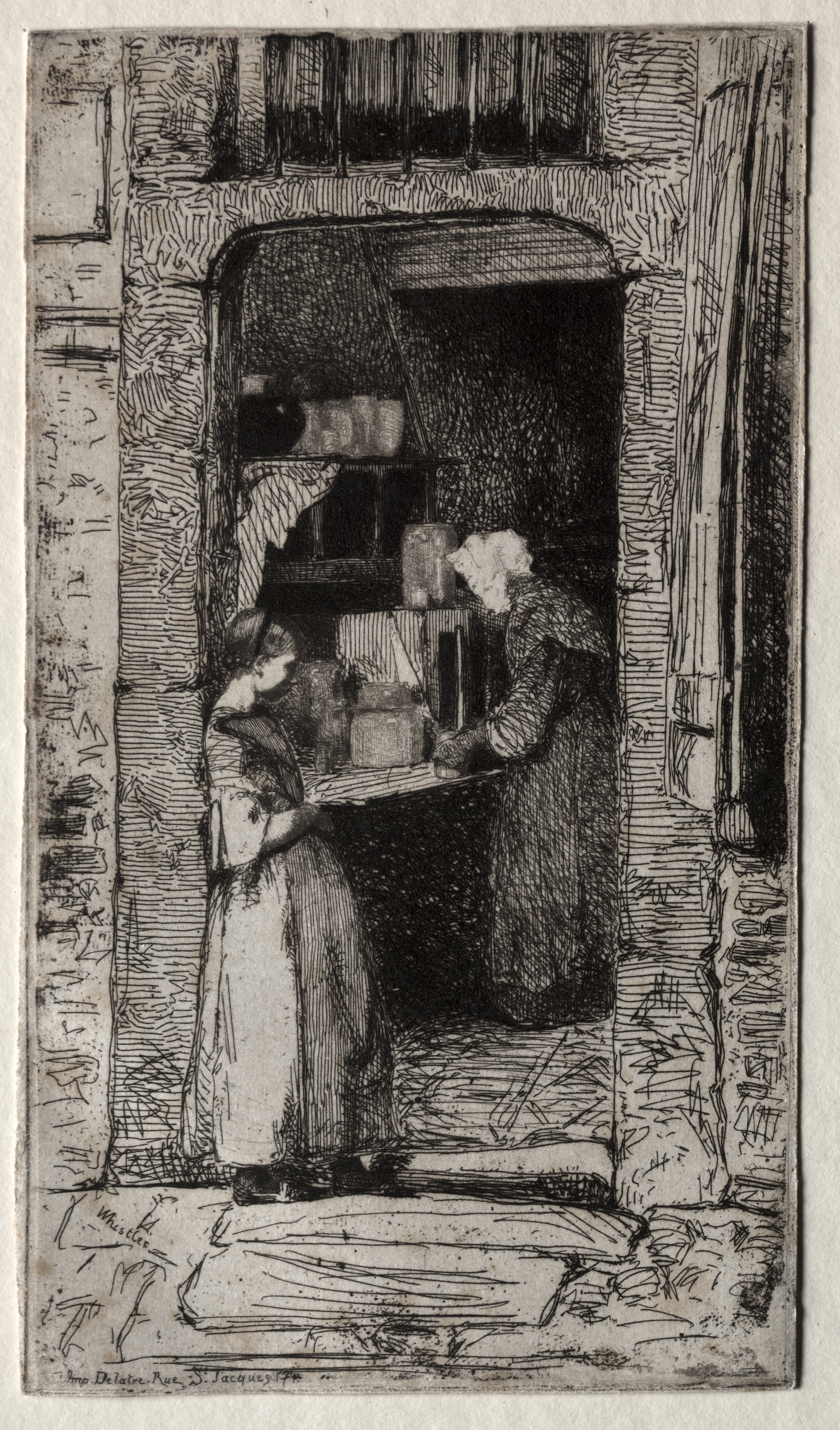 Black and white image of a woman standing inside an open doorway on the right side, with another woman on the left side reaching over a countertop into the dark interior. The standing woman wears a long dress with puffed sleeves and a hat. The woman on the right wears a head covering and a long dress. The doorway opening is positioned in a brick wall with stones of various shapes and lined with brick and stone at the top. The background shows more interior detail within the recessed dark doorway, and faint illegible cursive writing appears on the bottom left with some legible words: Rue St. Jacques. The entire image is rendered in engraved lines.