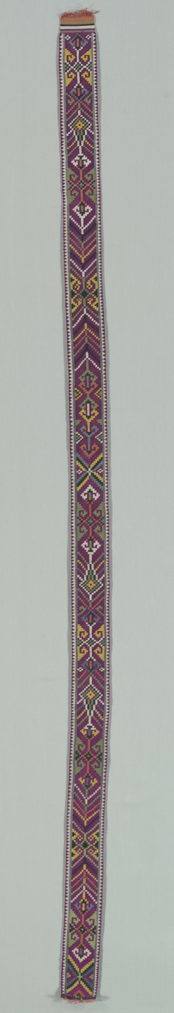 Long, narrow, fabric belt with a repeating pattern. The belt is mostly purple with yellow, red, green, and white designs. The belt has a brown end at the top. The background is gray. The title of the image is "Belt" and the artist is unknown.