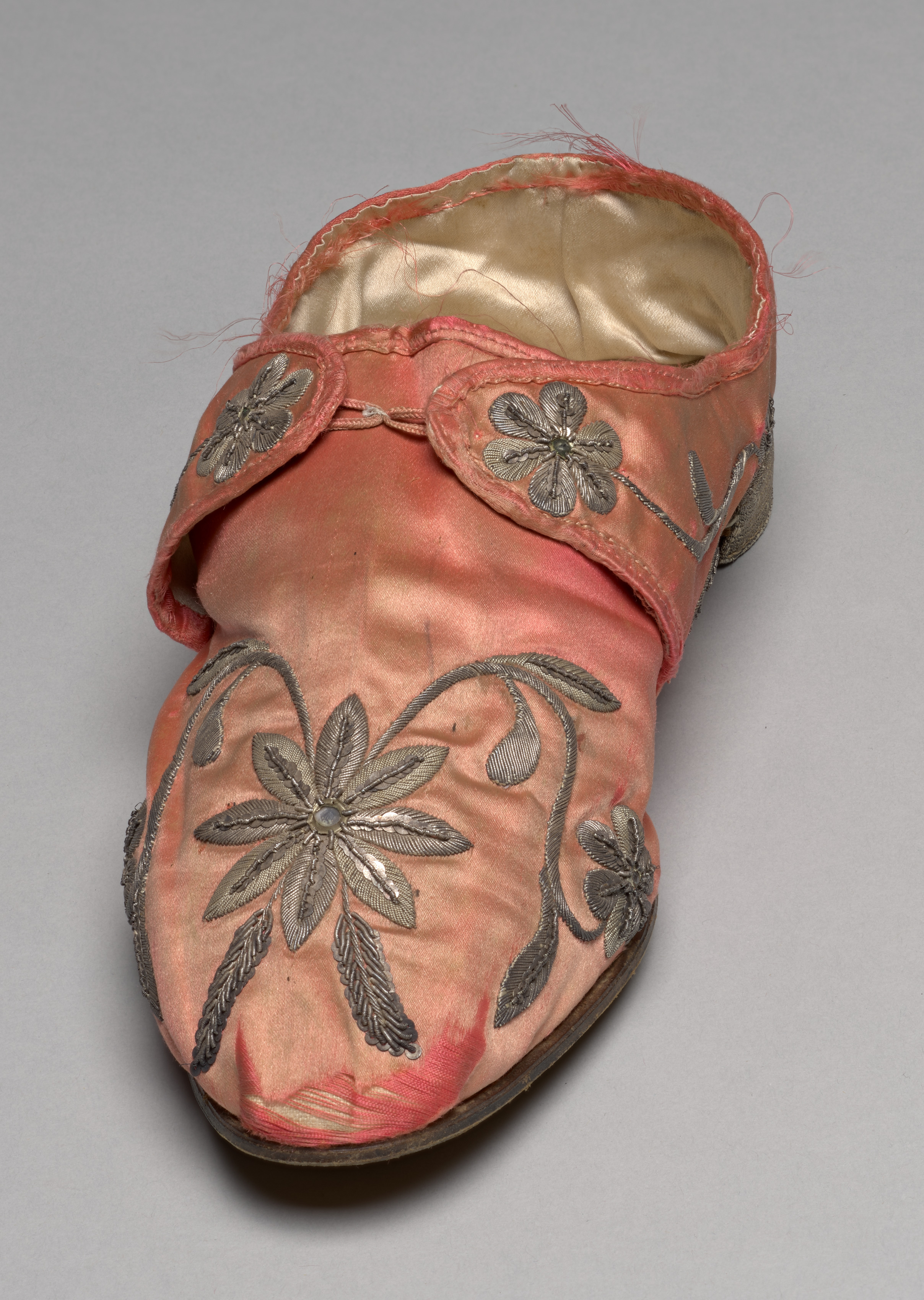 Pink satin shoe with a strap across the top, featuring floral designs in silver thread. The interior is lined with gold satin. A strap wraps around the top, secured with a small bow. The toe box is rounded. The shoe has a flat sole. The background is gray. Title: Slipper (one of a pair).