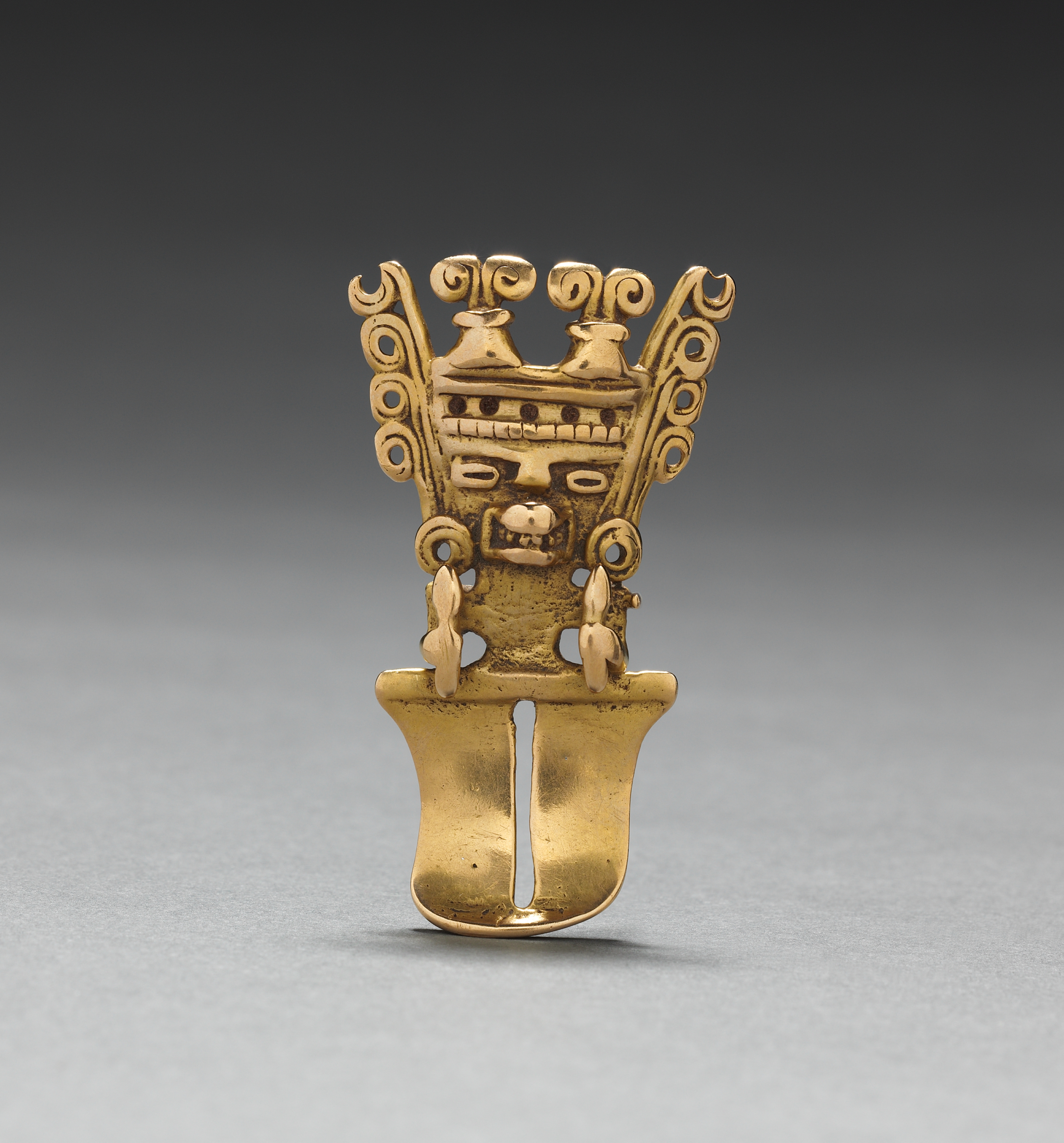 Gold-colored metal figurine pendant with a face and scrollwork on a gray background. The pendant is shaped like a crown or headdress, featuring a face with a large nose and teeth at the bottom. Two scrollwork designs protrude from the top of the pendant on either side, while two small loops hang from the face on either side. A curved piece of metal extends downwards from the face, with a vertical slit down the middle. The background transitions from dark gray at the top to light gray at the bottom.