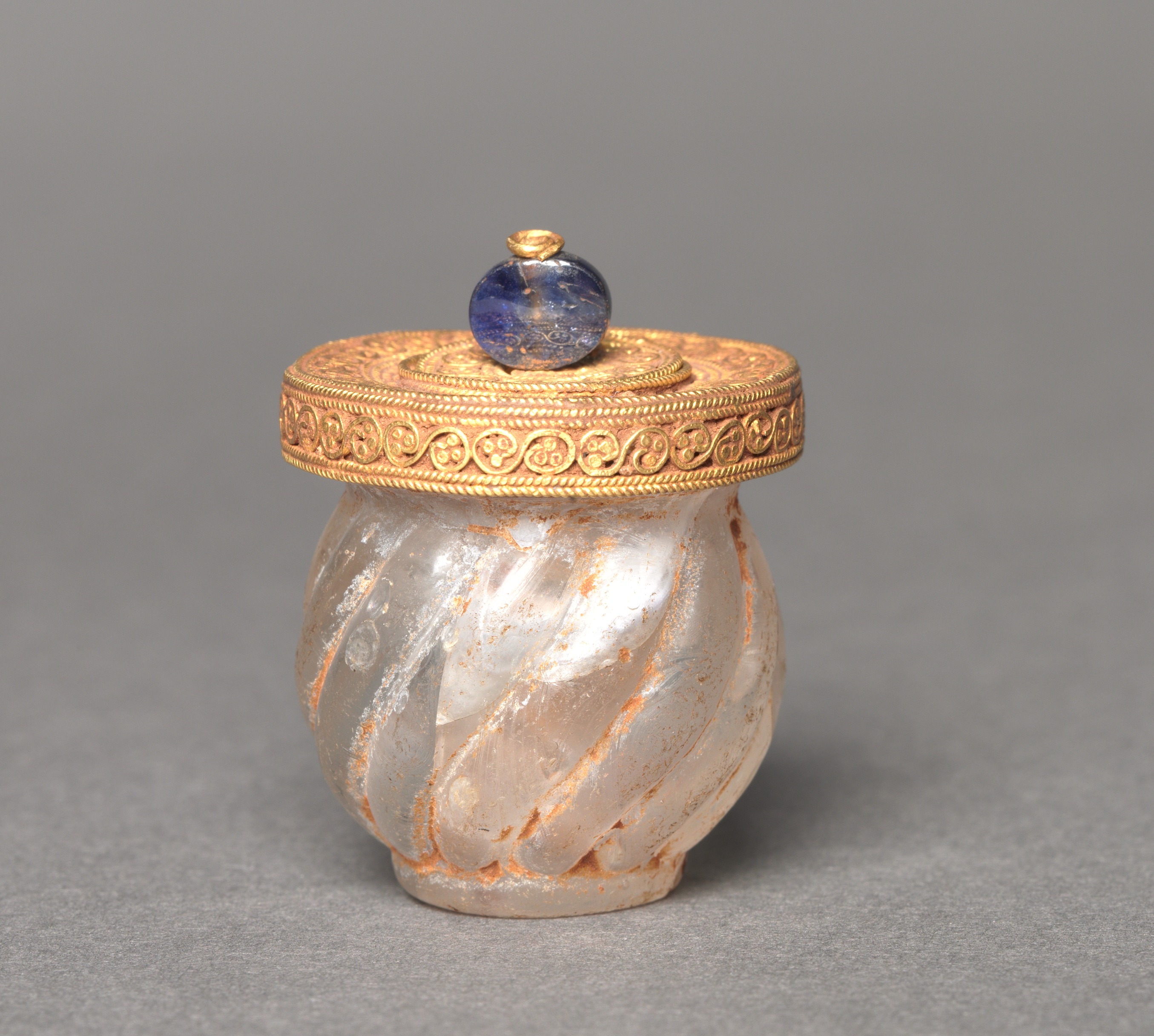Cosmetic Jar with Lid, gold and stone. The jar has a rounded body with a wide mouth, made of a white stone with orange veins, and a gold lid with a decorative edge and a blue stone knob on top. The lid features a twisted rope design around its edge. The blue stone knob is spherical with a small gold cap on top. The background is a solid gray color.