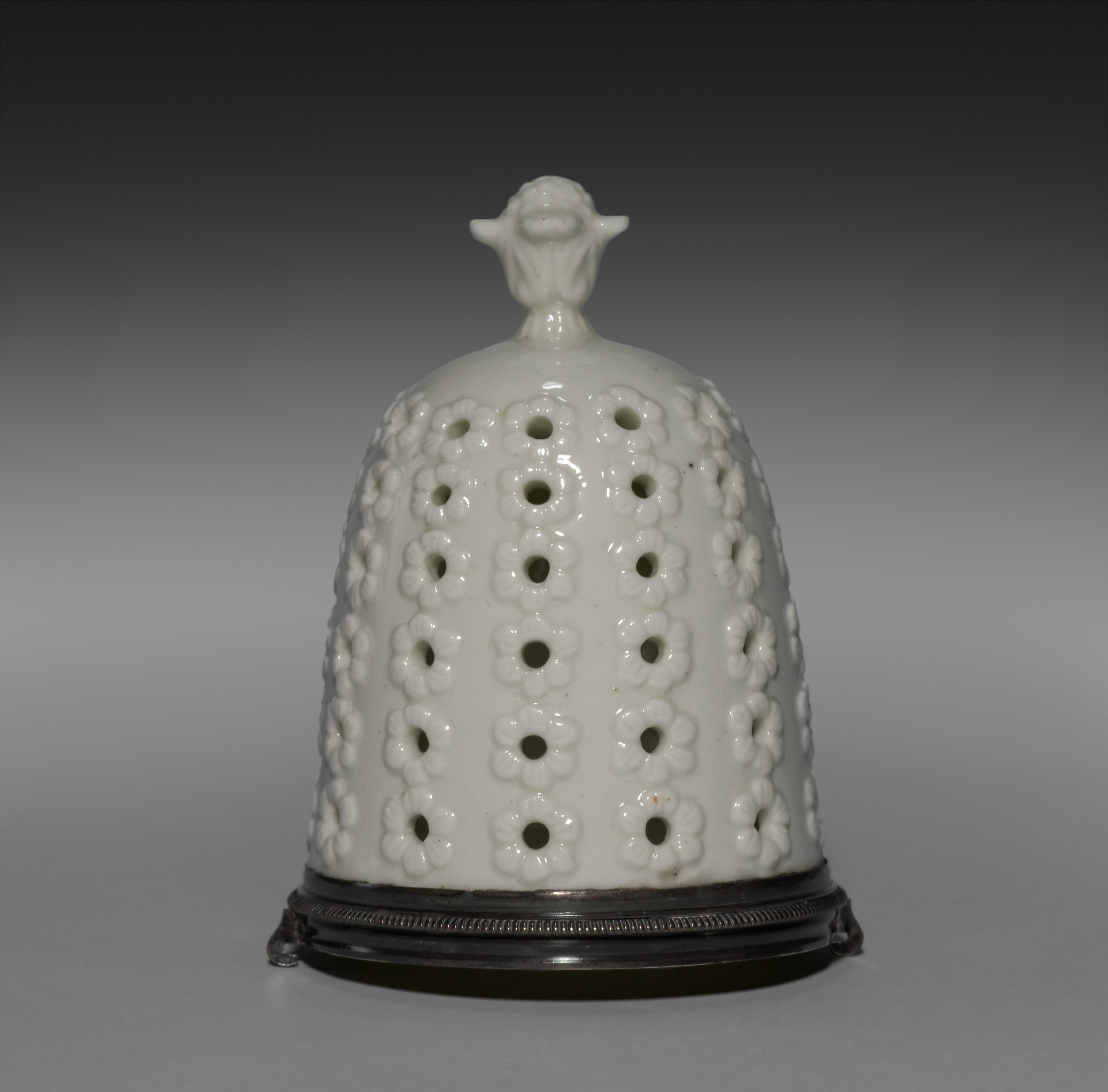 White ceramic sugar caster with a domed lid, featuring a finial on top resembling a face with two small ears or horns. The body of the caster is covered in a repeating pattern of small flowers with rounded petals and holes in the center. The base is circular and made of dark metal, with a decorative edge and three small feet. The caster sits on a gray gradient background that transitions from dark at the top to light at the bottom.
