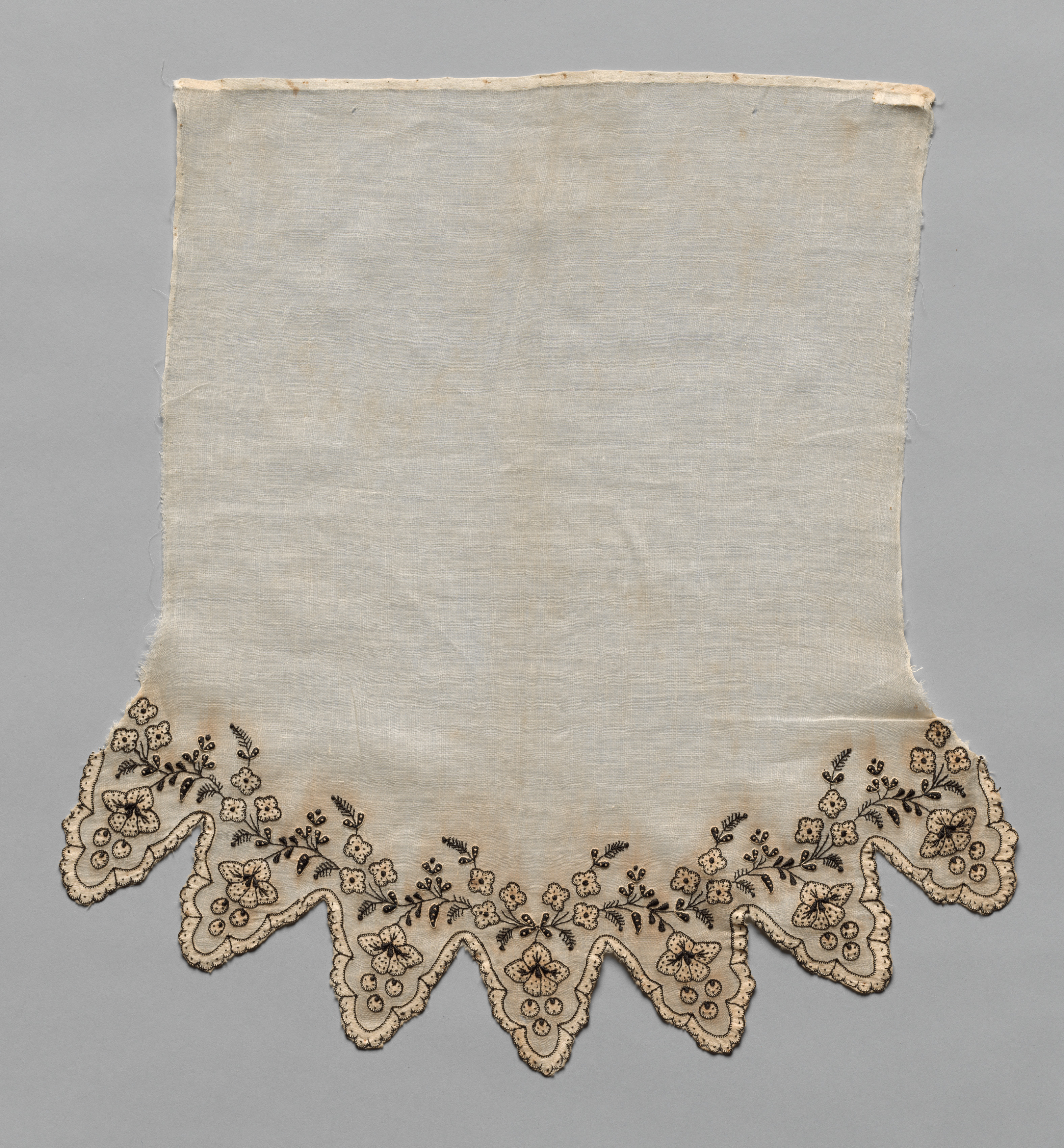 Off-white fabric square with straight top edge and scalloped bottom edge. The bottom edge has a repeating floral pattern in black thread. The fabric appears to be linen or a similar natural fiber. The background behind the fabric is gray. The fabric is titled "Sleeve (one of two)" and is by an unnamed artist.