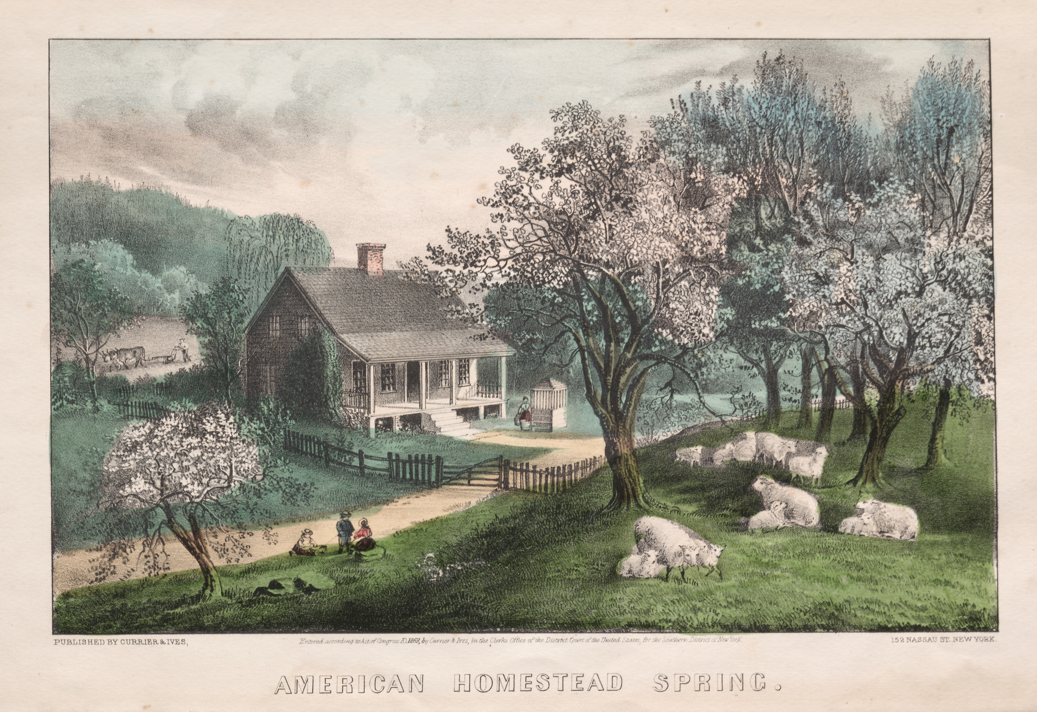 The image shows a large house with a porch and a fenced yard. The house is two stories, with a gable roof and a chimney. A dirt path leads to the house from the bottom left. In the foreground, there are several white sheep lying on the grass. There are also trees with white blossoms. Two children sit on the grass near the path. A woman pushes a stroller near the house. A horse-drawn cart is visible on a road in the background. The sky is cloudy. The image depicts a rural scene with a house, animals, and people. The title "American Homestead, Spring" is at the bottom.