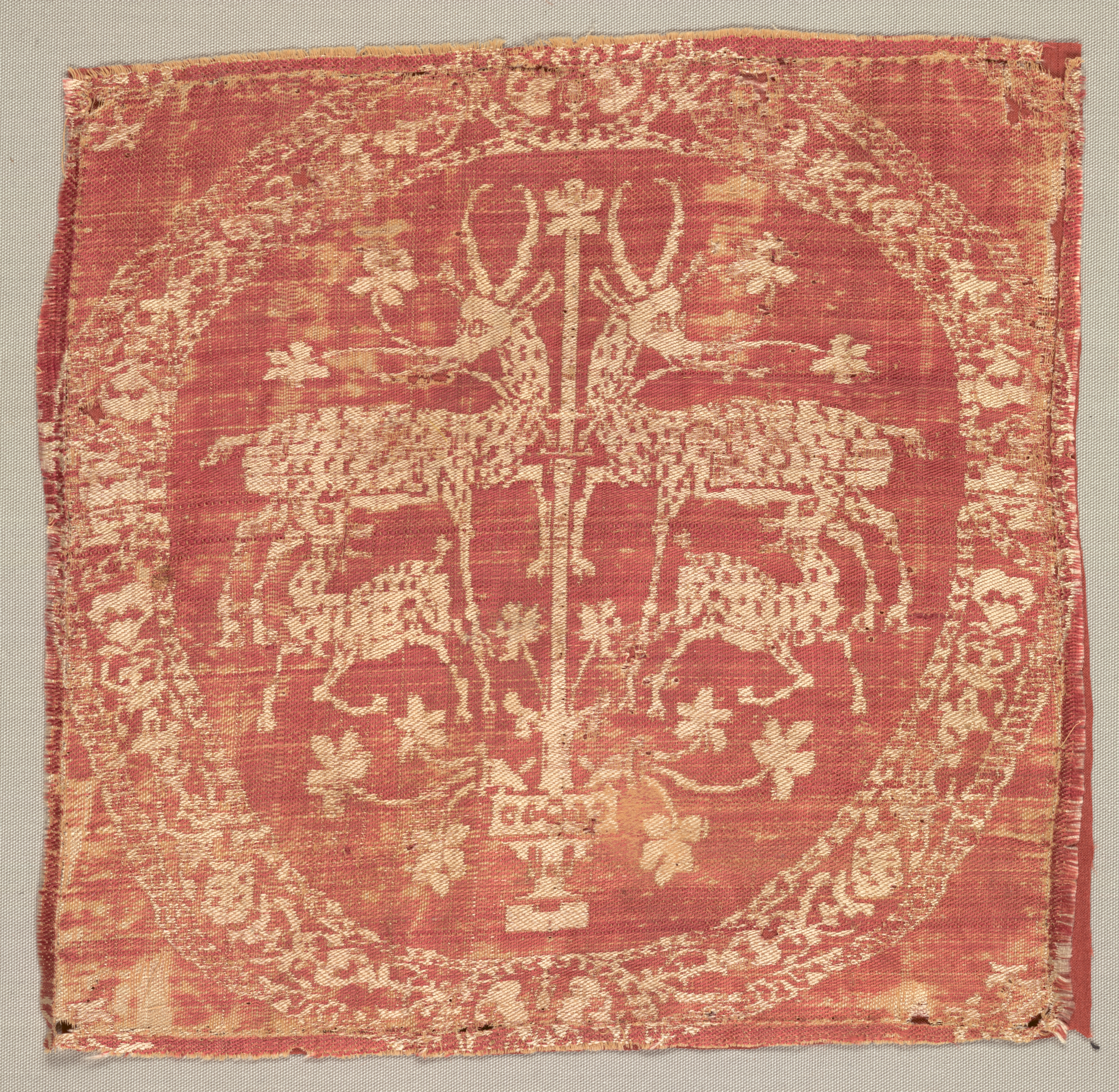 Square ornament from a tunic by unknown artist. Red fabric square with frayed edges. The fabric features a central design of two deer on either side of a vertical pole with a cross at the top. The deer are surrounded by a floral pattern and an oval border. The design is in a lighter color than the background. The background of the fabric is a solid red color. The fabric appears to be old and worn. The square is set against a beige background.