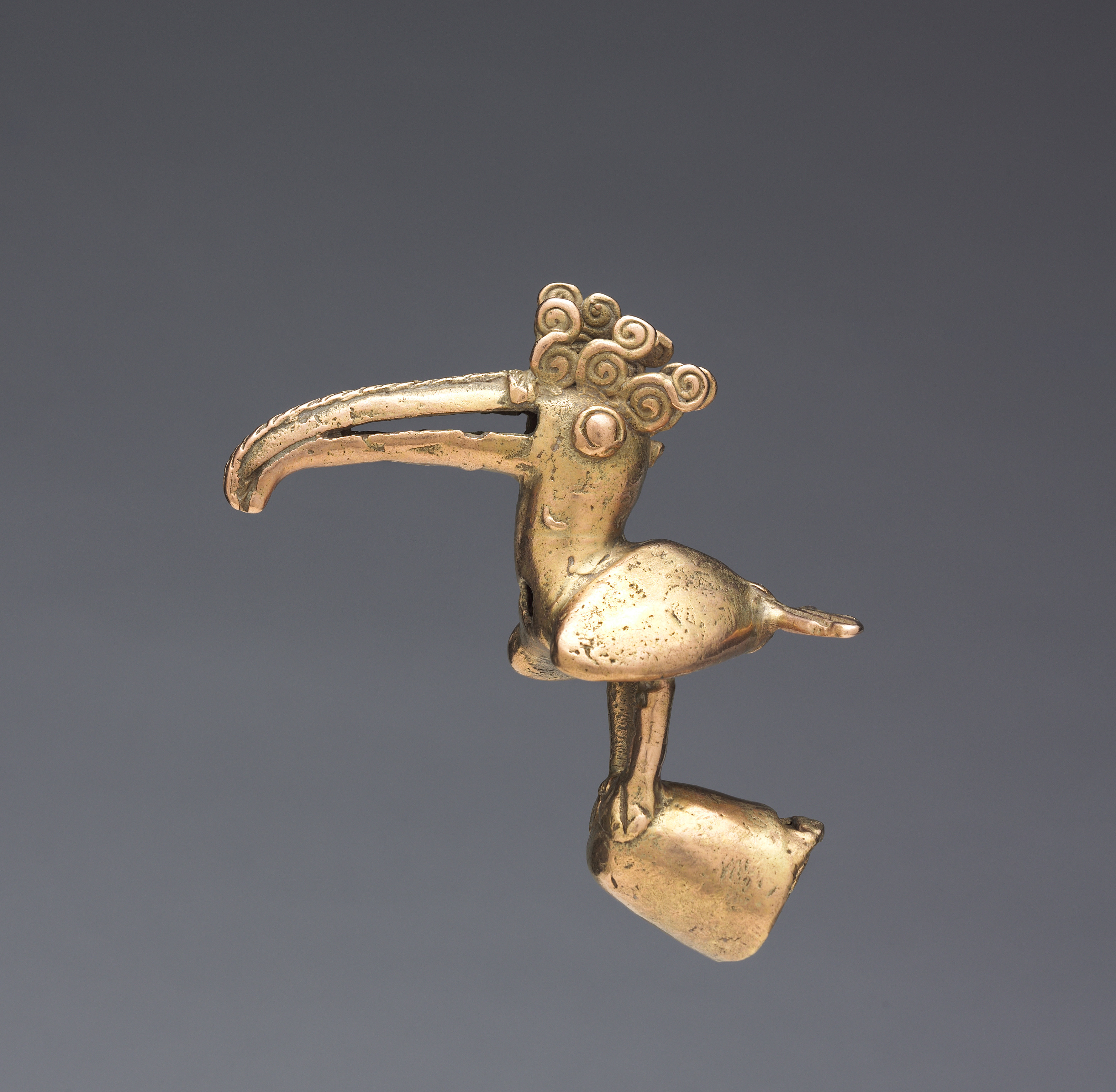 Gold-colored metal object in the shape of a bird with a long curved beak and curly feathers on top of its head. The bird has a large body, long legs, and a short tail. Its head is tilted slightly to the left. The object appears to be attached to a cylindrical base or handle. The background is dark gray. Title: Staff Head. Artist: unknown.