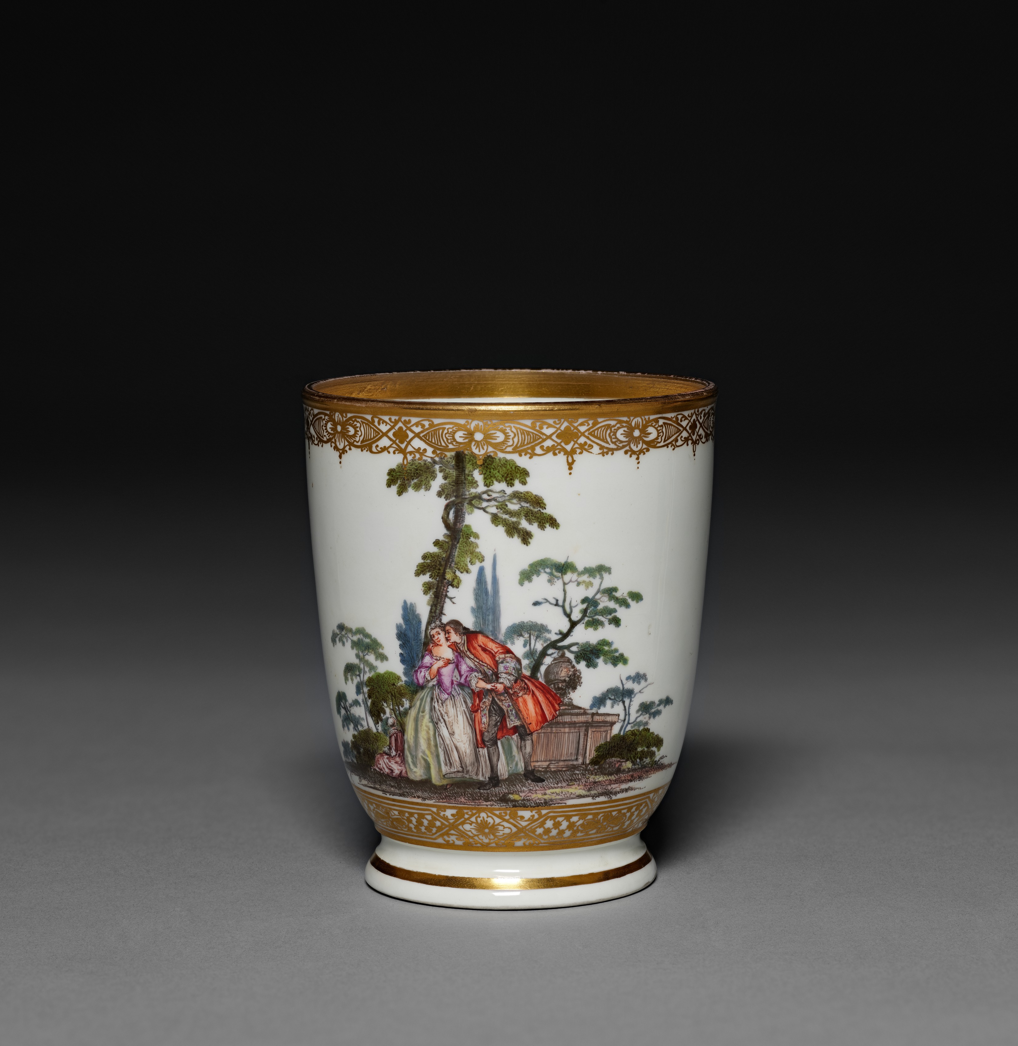 White porcelain beaker with a rounded body and a short foot. The beaker features a gold rim and a decorative gold band around the top and bottom. A colorful scene depicting a couple embracing is painted on the body of the beaker. The couple stands in front of trees and a wooden fence. The woman wears a pink top and a green skirt; the man wears an orange coat. The background of the image is dark gray, with the beaker casting a shadow.