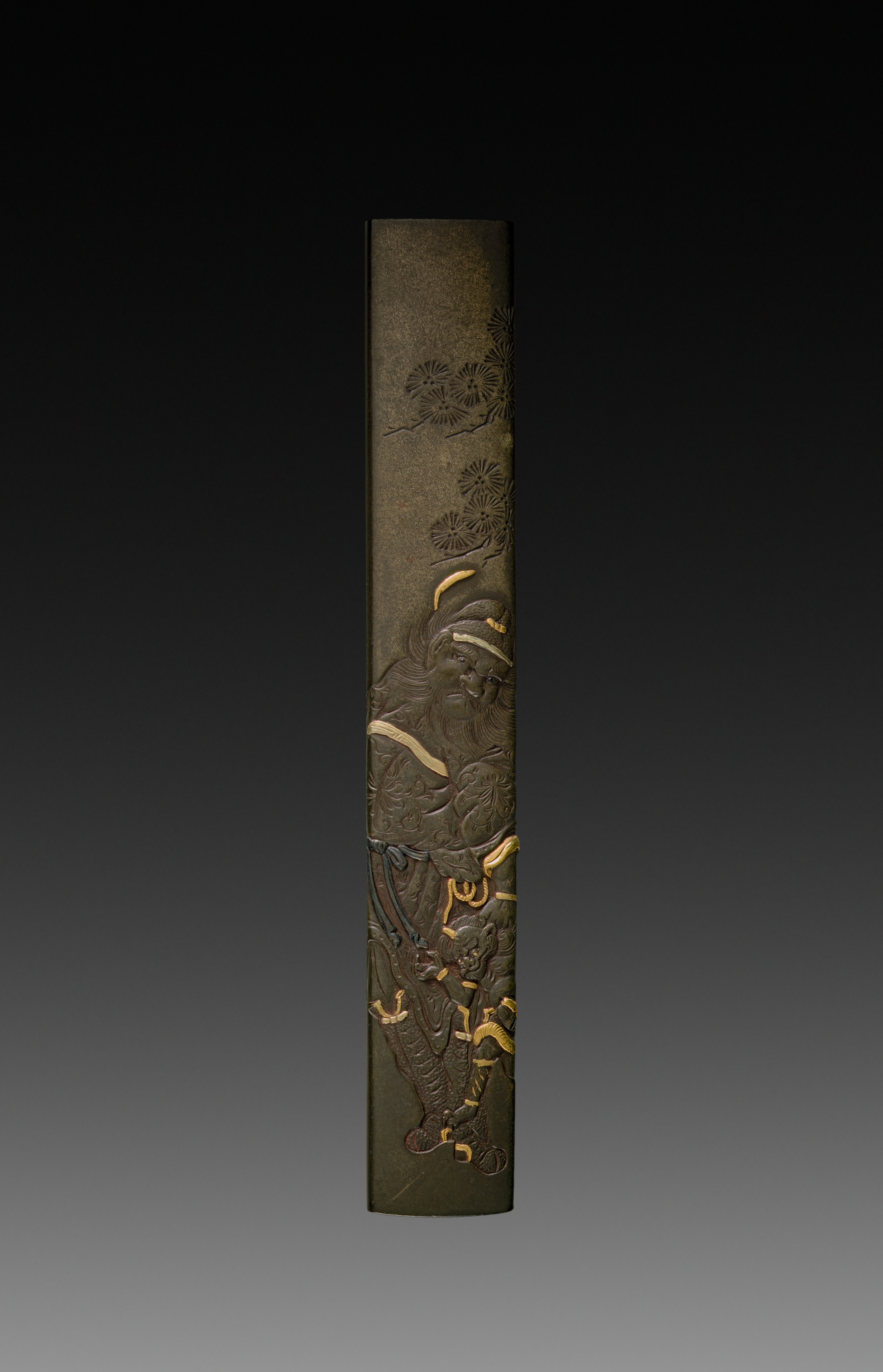 The image depicts a Knife Handle, also known as a Kozuka. The object is long and rectangular with rounded edges. The handle is dark brown with a textured surface. It features an intricately carved design of a mythical creature, possibly a dragon or a bird-like creature with a long beak. The carving includes gold accents. The creature appears to be emerging from waves or water. The background of the image transitions from black at the top to gray at the bottom. The overall appearance suggests that the object is made of metal or a similar material. The artist of the piece is unknown.