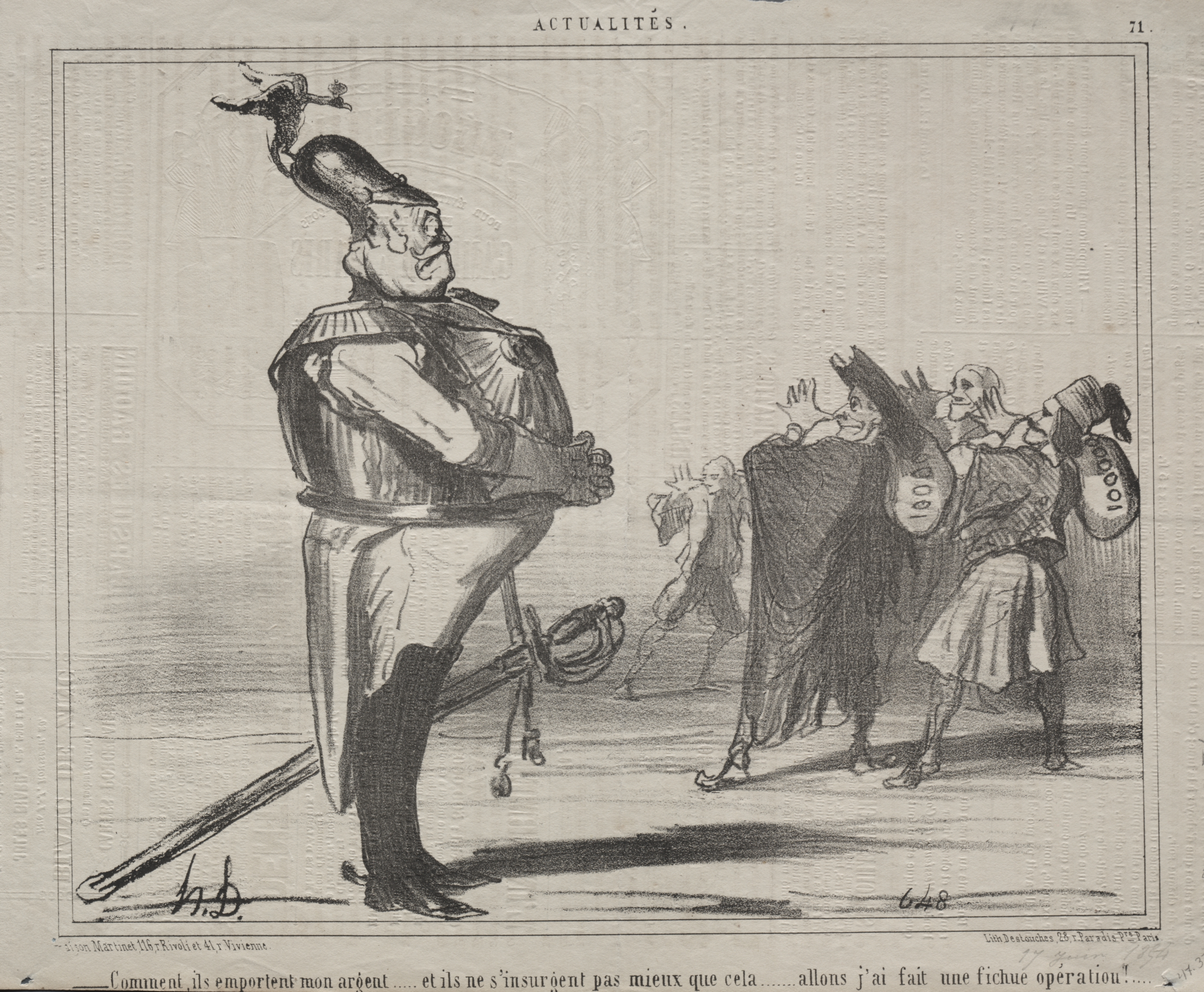 Black and white drawing of a man in a military-style uniform with a tall hat on. The man is wearing a vest and pants with a sword at his side. He appears to be standing with one leg bent. There is a group of people to the right. The image has a box border. The title at the top reads "Actualites". Text appears at the bottom.