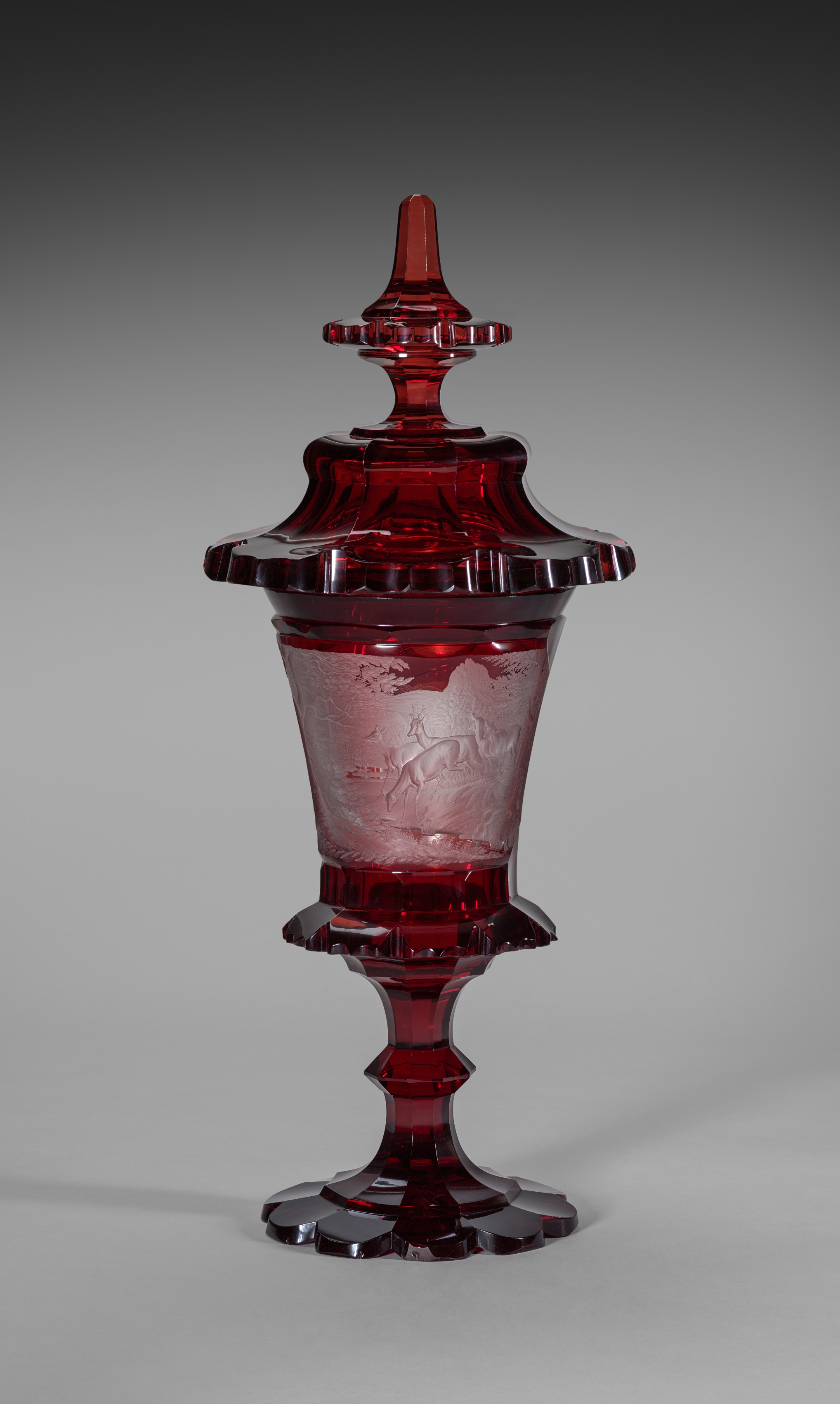 Red glass covered cup with a lid and a stem base. The body of the cup is translucent with an etched design featuring a horse and rider. The cup has a wide mouth and a narrow neck. The lid is finial-topped. The base is faceted. The background is a gradient from black to gray.