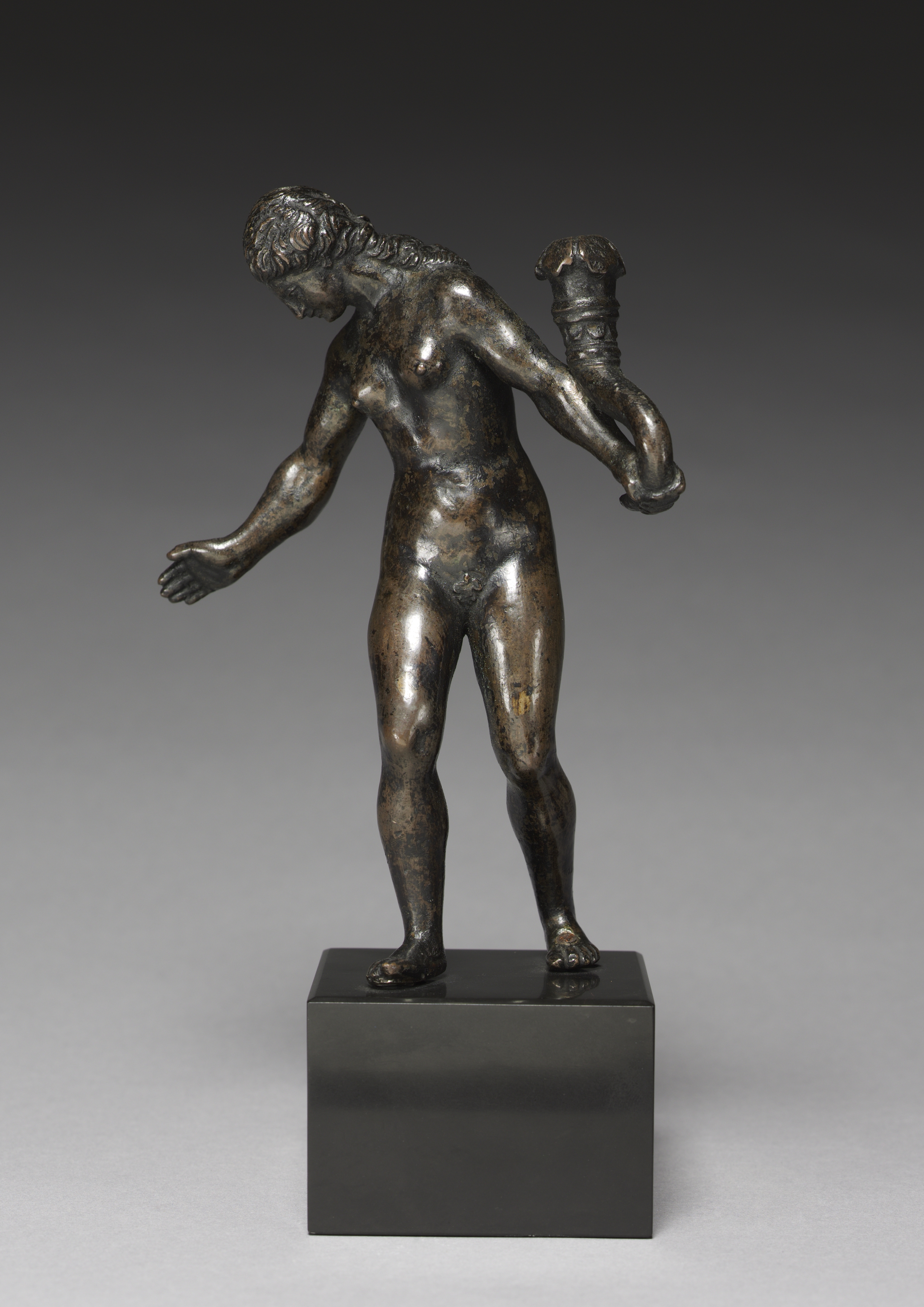 The sculpture depicts a nude male figure with short hair. He has his left arm extended outward at shoulder height. His left leg is straight and weight-bearing, while the right leg is slightly bent. He holds an object, possibly a cornucopia, in the right hand behind his back. The sculpture appears to be made of dark-colored metal with visible signs of aging or patination. The figure stands on a black square base.