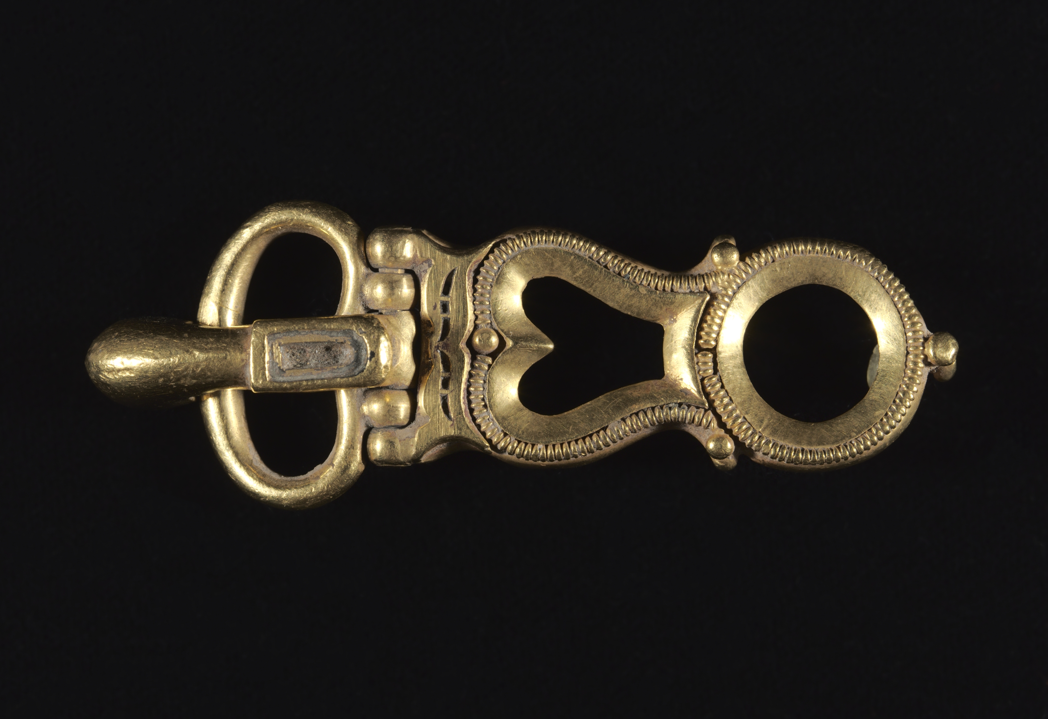 The image shows a brass-colored buckle, Buckle by artist not provided, against a black background. The buckle is composed of two main parts: a central section with a rounded rectangular shape and two protruding circles on either side. The central section features an intricate design with curved lines and small bumps. A protruding horizontal bar extends from the left side of the buckle. The buckle's surface exhibits a brushed or textured finish. The background is a solid black color.