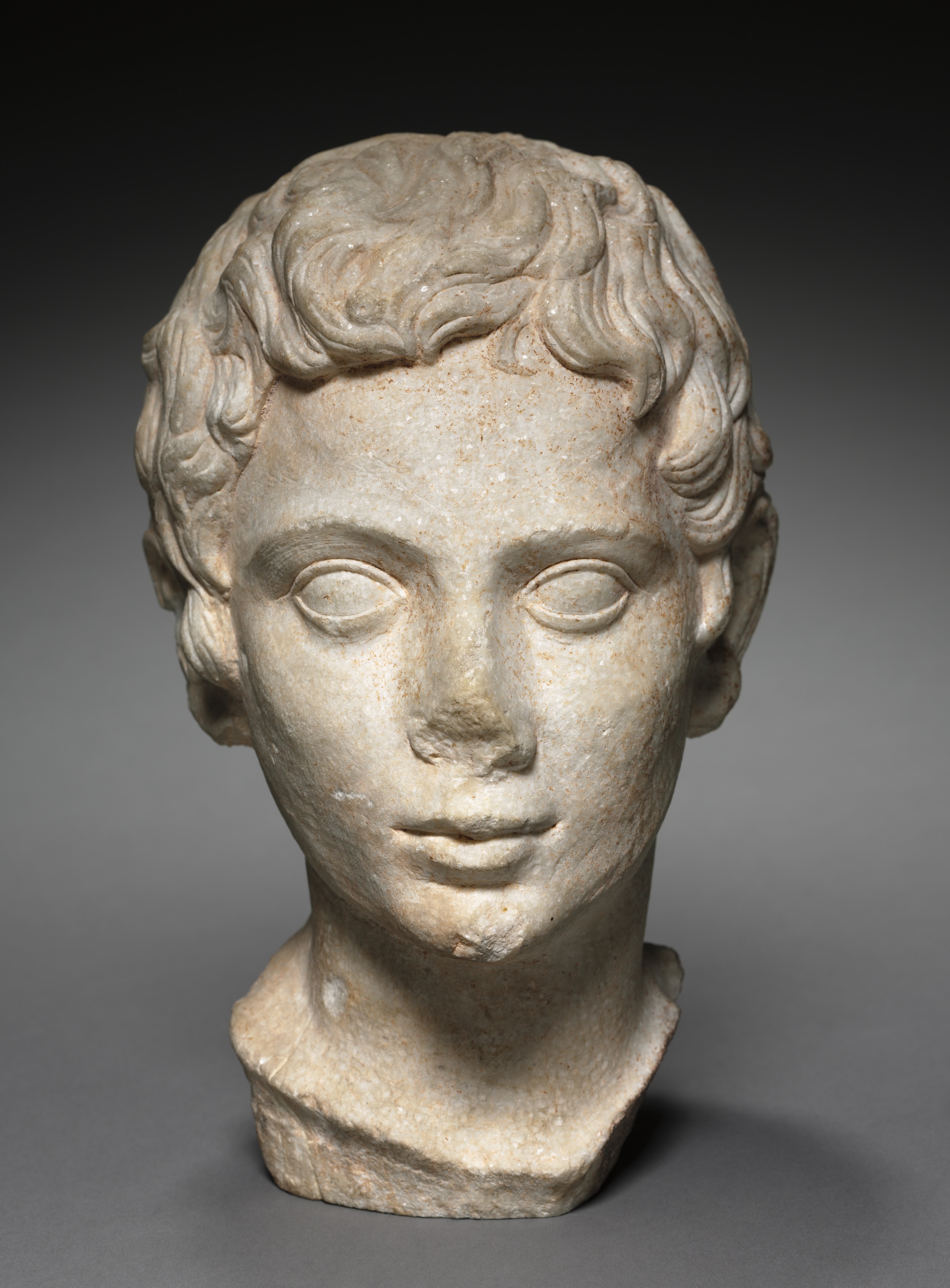 Portrait Head of a Youth by unknown artist. A stone sculpture of a young man's head. The sculpture is angled slightly to the right. The young man has short curly hair. The eyes are almond-shaped and the eyelids are heavy. The nose is straight. The lips are thin and almost closed. The sculpture ends at the chest area. The background is dark gray and gets lighter toward the center. A shadow is cast to the right.