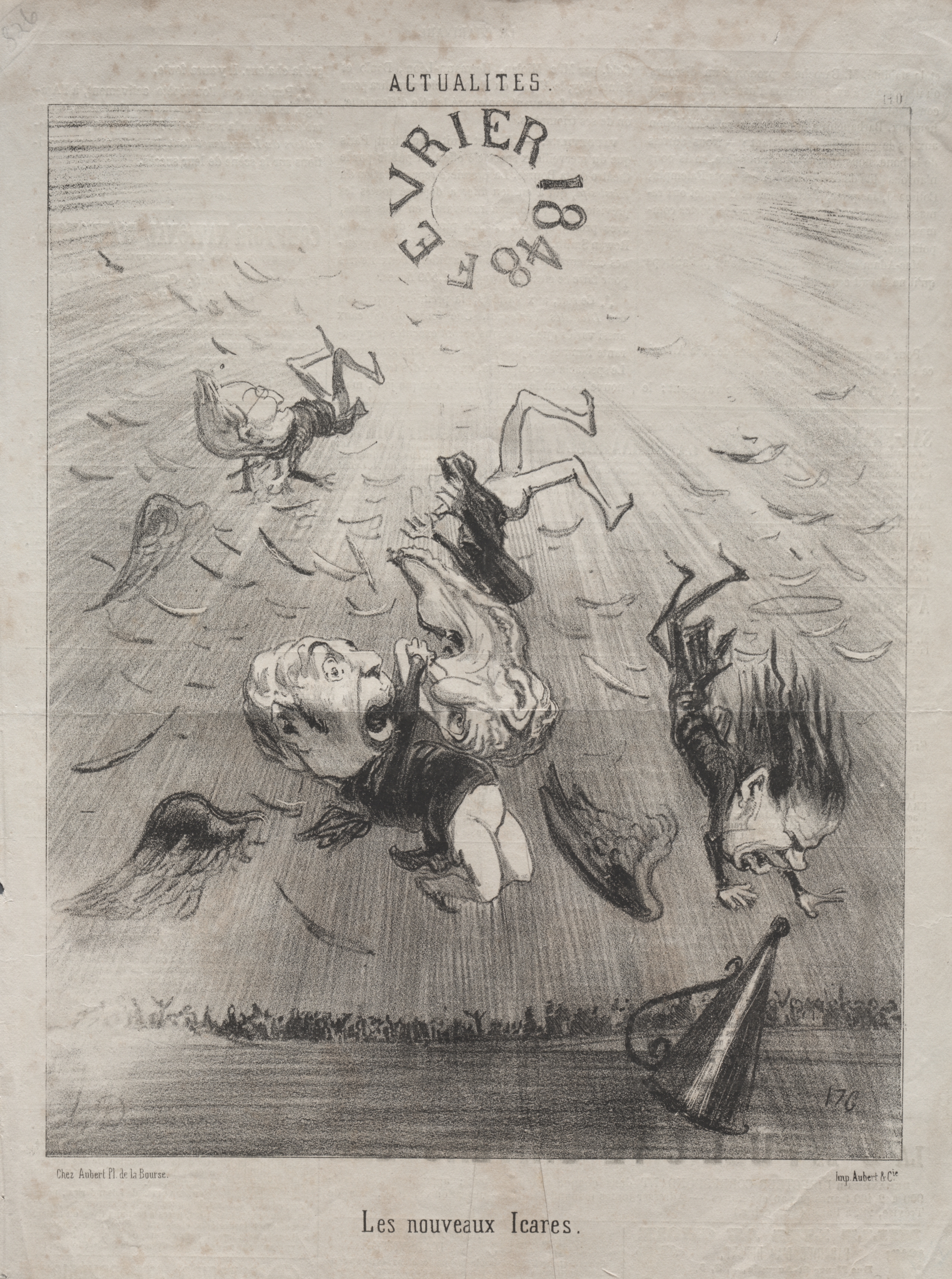 Black and white drawing of three men falling headfirst from the sky. The man on the left wears a top hat and holds papers. A winged object resembling a bird or a piece of paper is next to him. The middle figure wears a suit and tie. The man on the right wears a suit and top hat; a winged object resembling a hat or umbrella is next to him. The background shows a line of people on the ground. Text at the top reads "actualites" and a semi-circle of text reads "Fevrier 1848". Text at the bottom reads "Les nouveaux Icares".