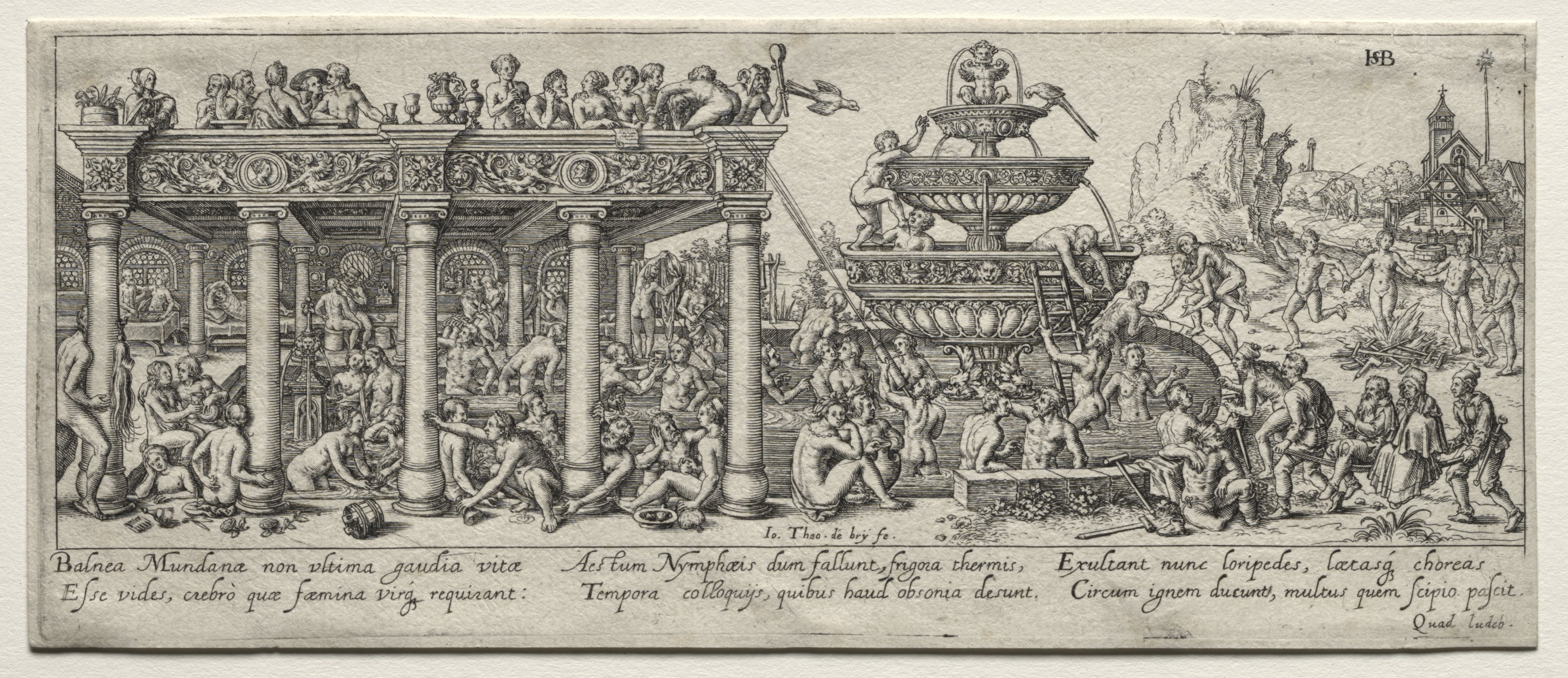 Black and white illustration depicting a crowded scene around a large ornate fountain. The fountain has multiple tiers with water flowing from the top. People are gathered around the fountain and a structure with columns, some engaging in activities like bathing. The structure has a decorative top with figures. In the background, there are buildings and a church. The scene includes numerous human figures, some nude, others partially clothed. Text is written in Latin at the bottom of the illustration. The overall style is detailed and ornate, characteristic of old European art. The image is titled "The Fountain of Youth" by Johann Theodor de Bry.