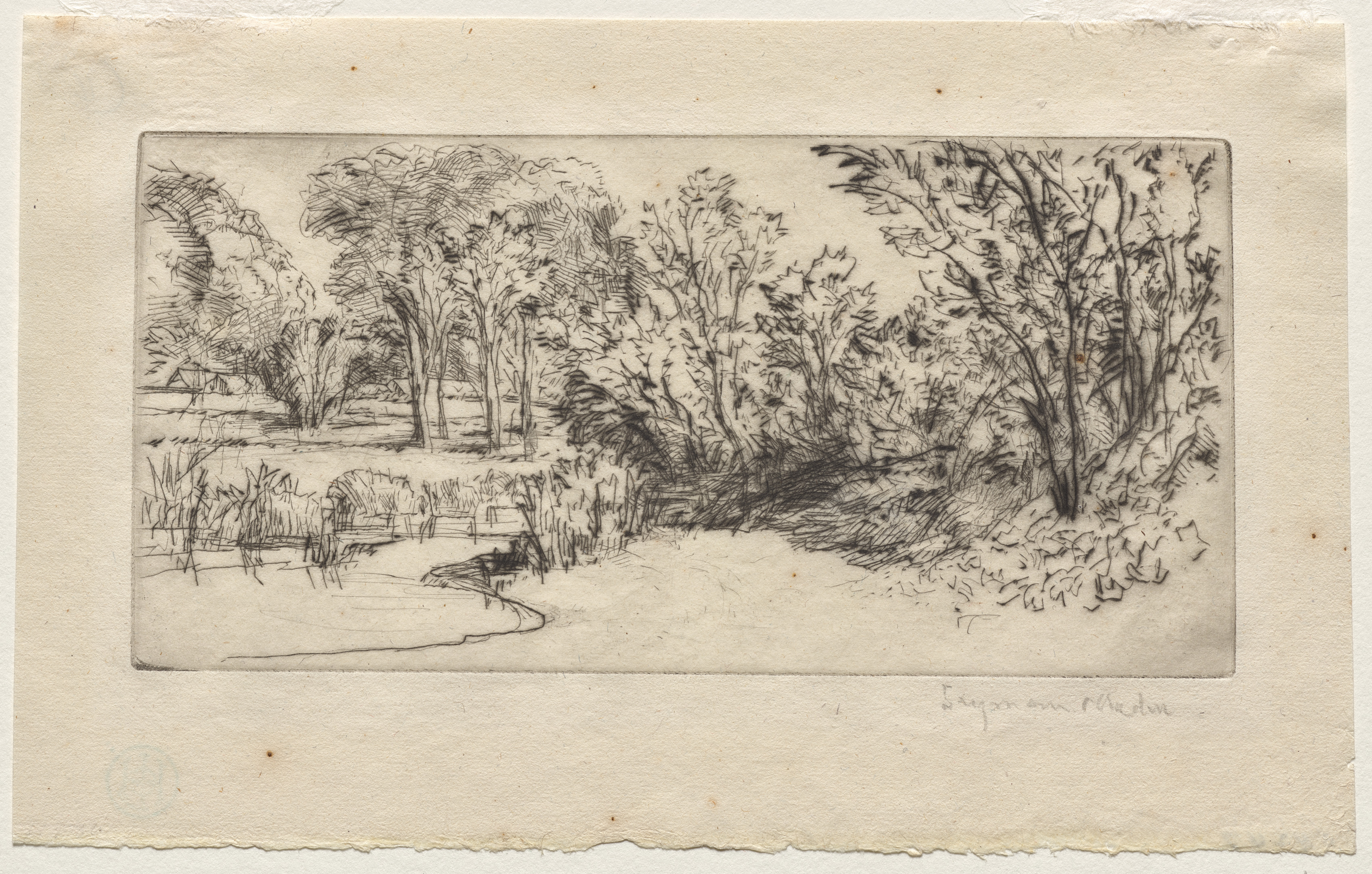 Black and white sketch of a wooded landscape with a stream. Trees and bushes line the right side and extend into the background. A field with tall grasses borders a curved stream on the left. A house and additional trees are in the background on the left. The sketch is signed in the lower right. The image has a rough, textured appearance and is on a beige background.