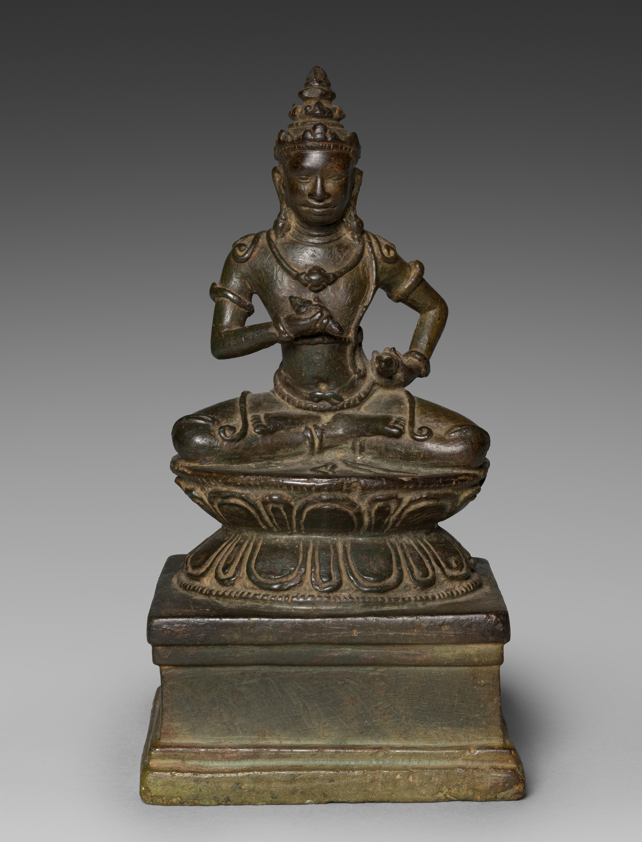 Bronze statue of Vajrasattva sitting cross-legged on a lotus flower with hands positioned near the chest, adorned with a crown and necklaces, on a square base.