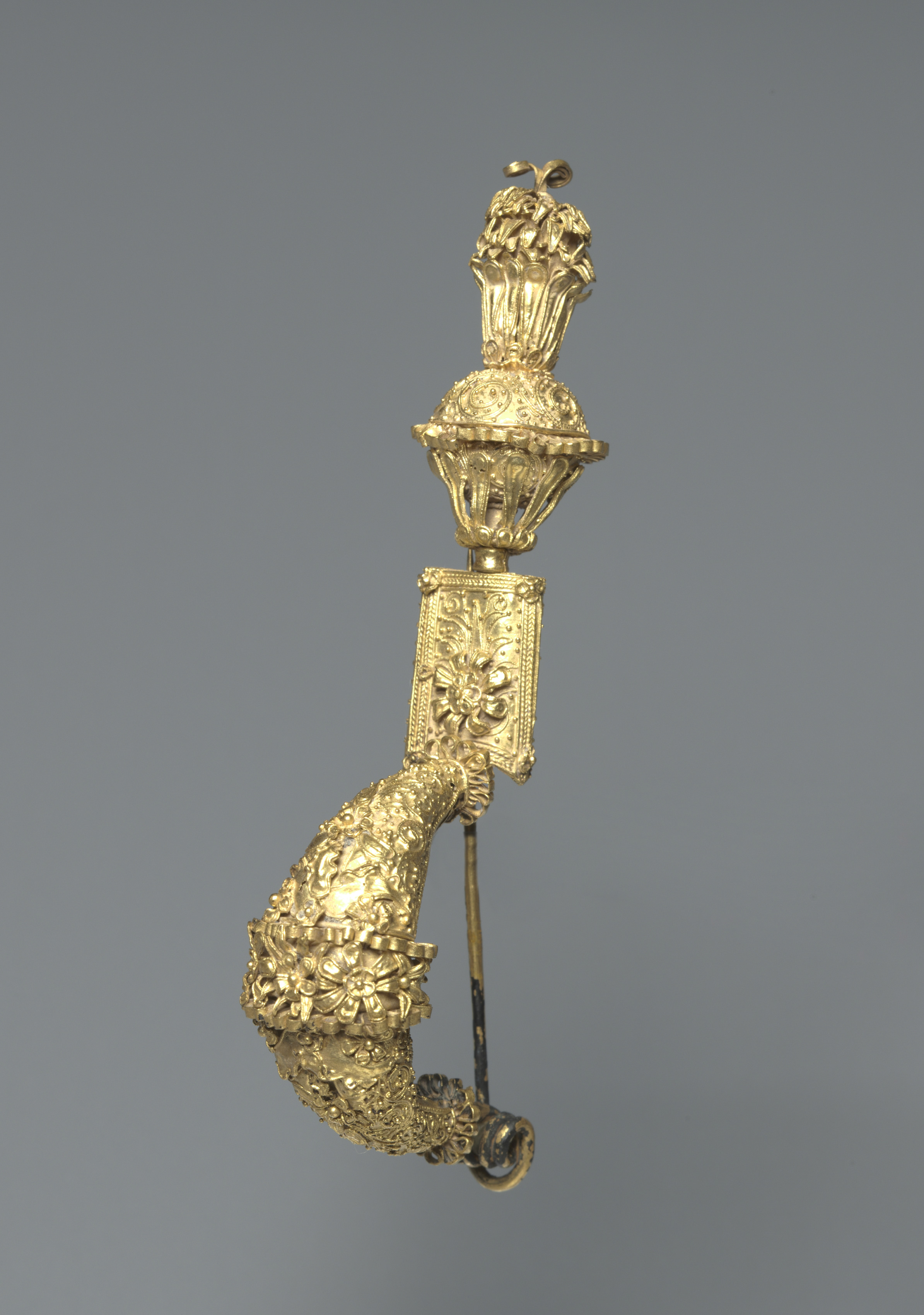 Gold-colored fibula, pin. Curved, hook-like shape with intricate floral designs throughout. Rectangular section in the middle with flower pattern. Top features a decorative element resembling a flower or plant. A pin or needle attached to the back.