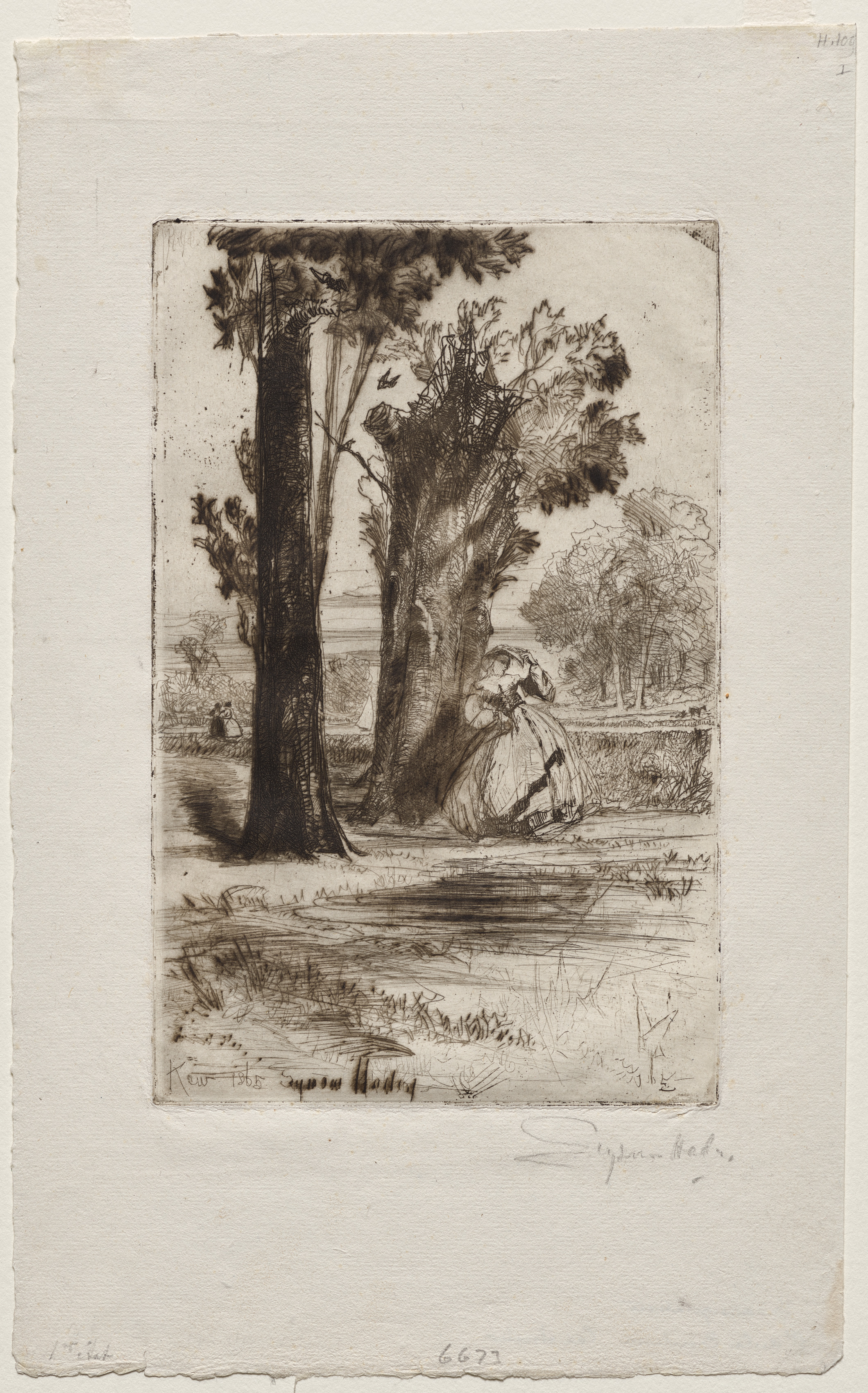 The Assignation by Francis Seymour Haden: A black and white sketch of two people sitting on the ground with their arms around each other, beside a body of water and two large trees with foliage; two more people are in the background on the left; more trees are in the background on the right; the image is rectangular and on a white, textured background.