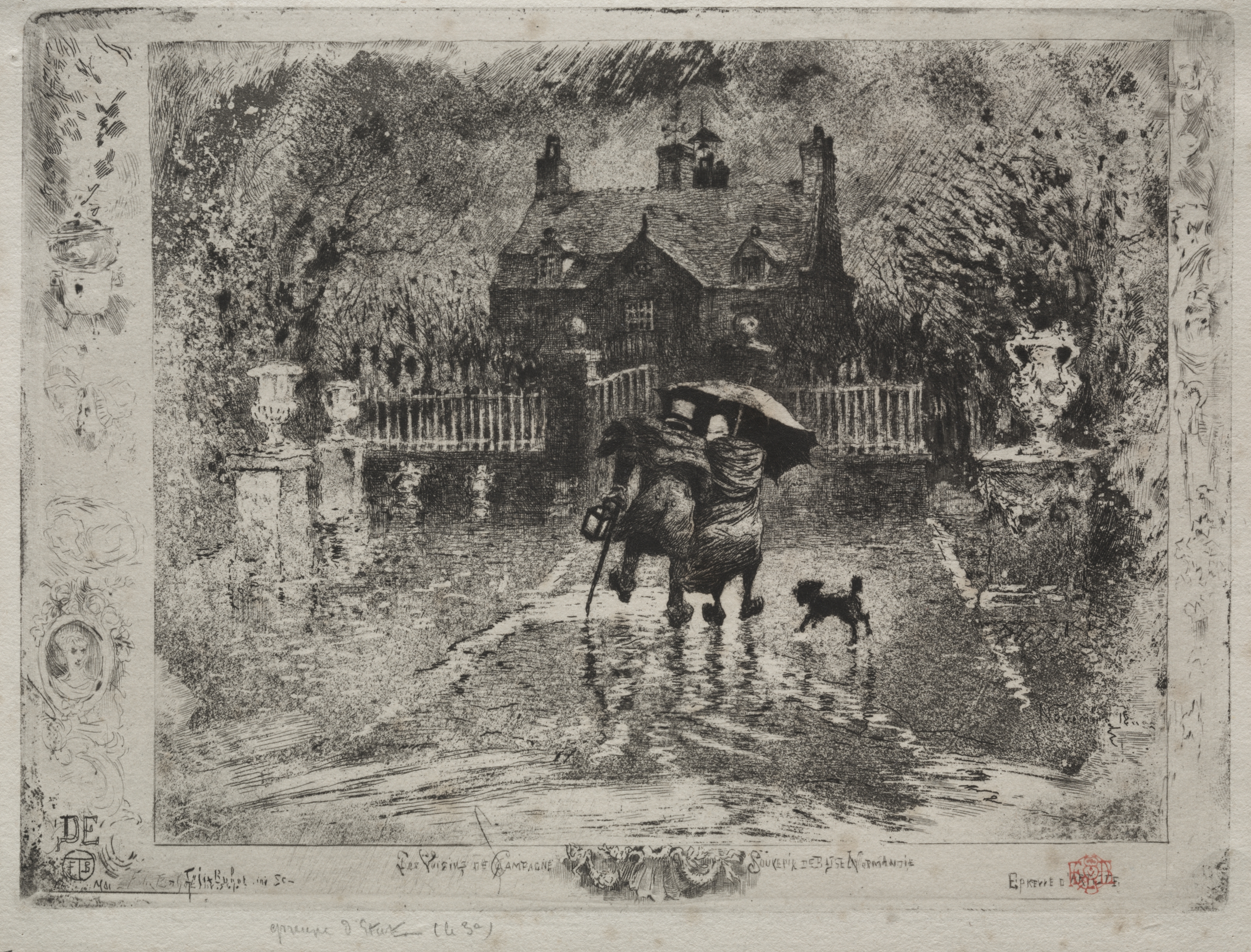 The image is a black and white etching of a man on horseback with a dog. The man wears a long coat and a hat, holds an umbrella in one hand and a stick in the other. The horse is in mid-gallop. The dog is small and dark-colored. They are on a stone path. There are puddles on the path. In the background, there is a large house with a fence and trees. The border of the etching has decorative elements, including a face in a circle. The etching is signed "The Country Neighbors by Félix Hilaire Buhot".