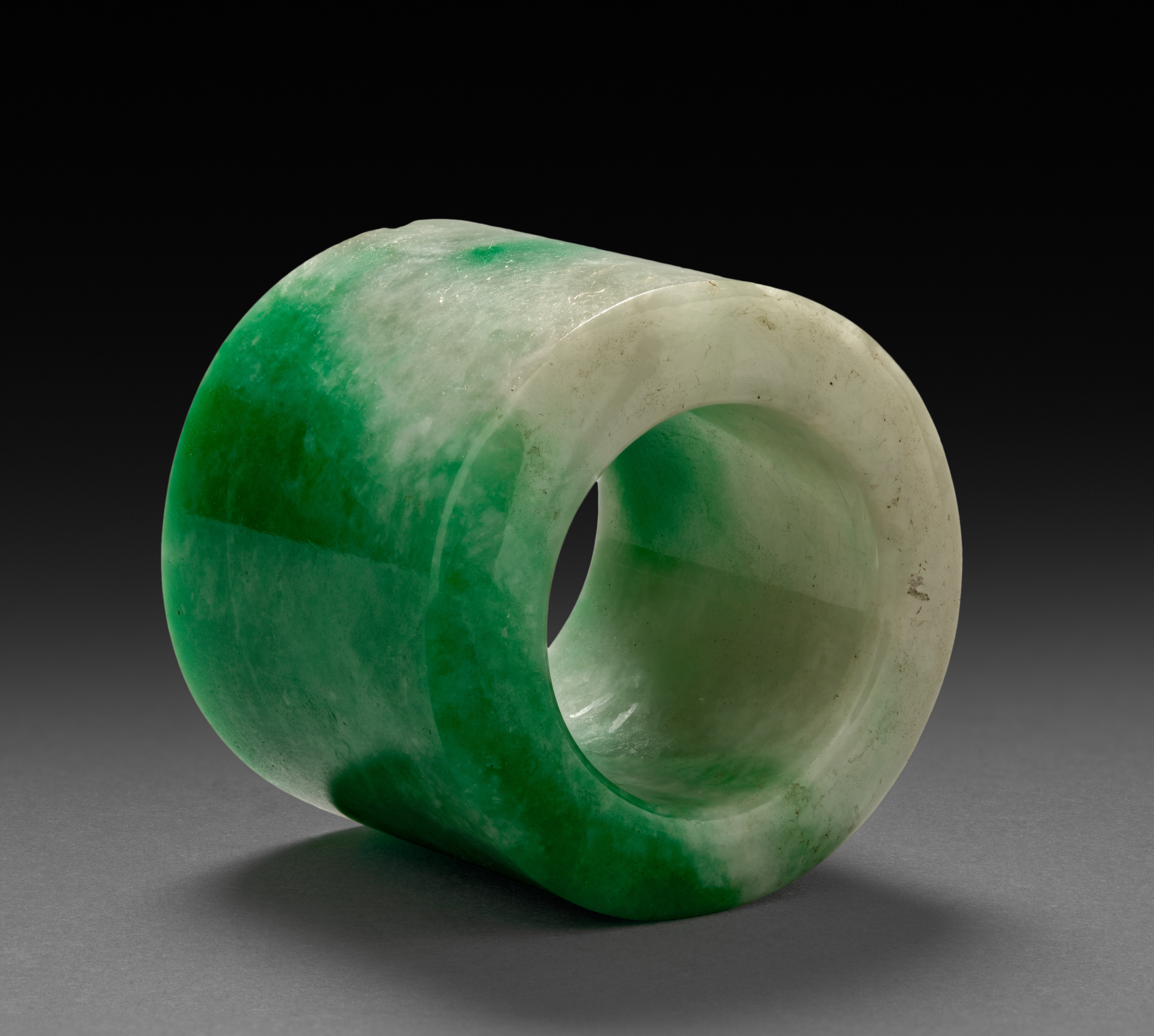 Green and white jade thumb ring with a rounded rectangular shape and a circular hole through the center, on a dark background.