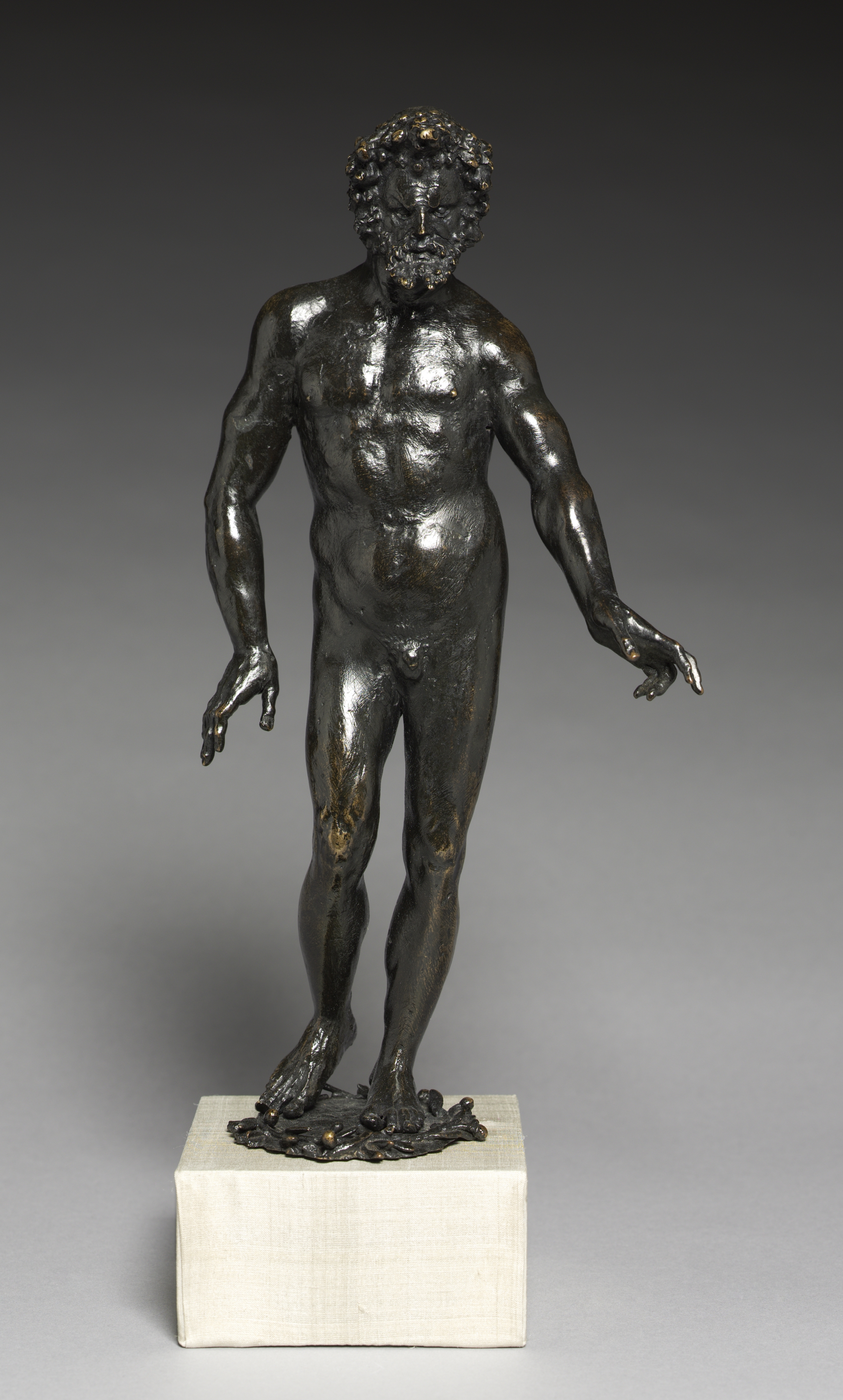 Dark-colored sculpture of a nude man with curly hair and beard; outstretched arms, right foot forward; standing on a square white base.