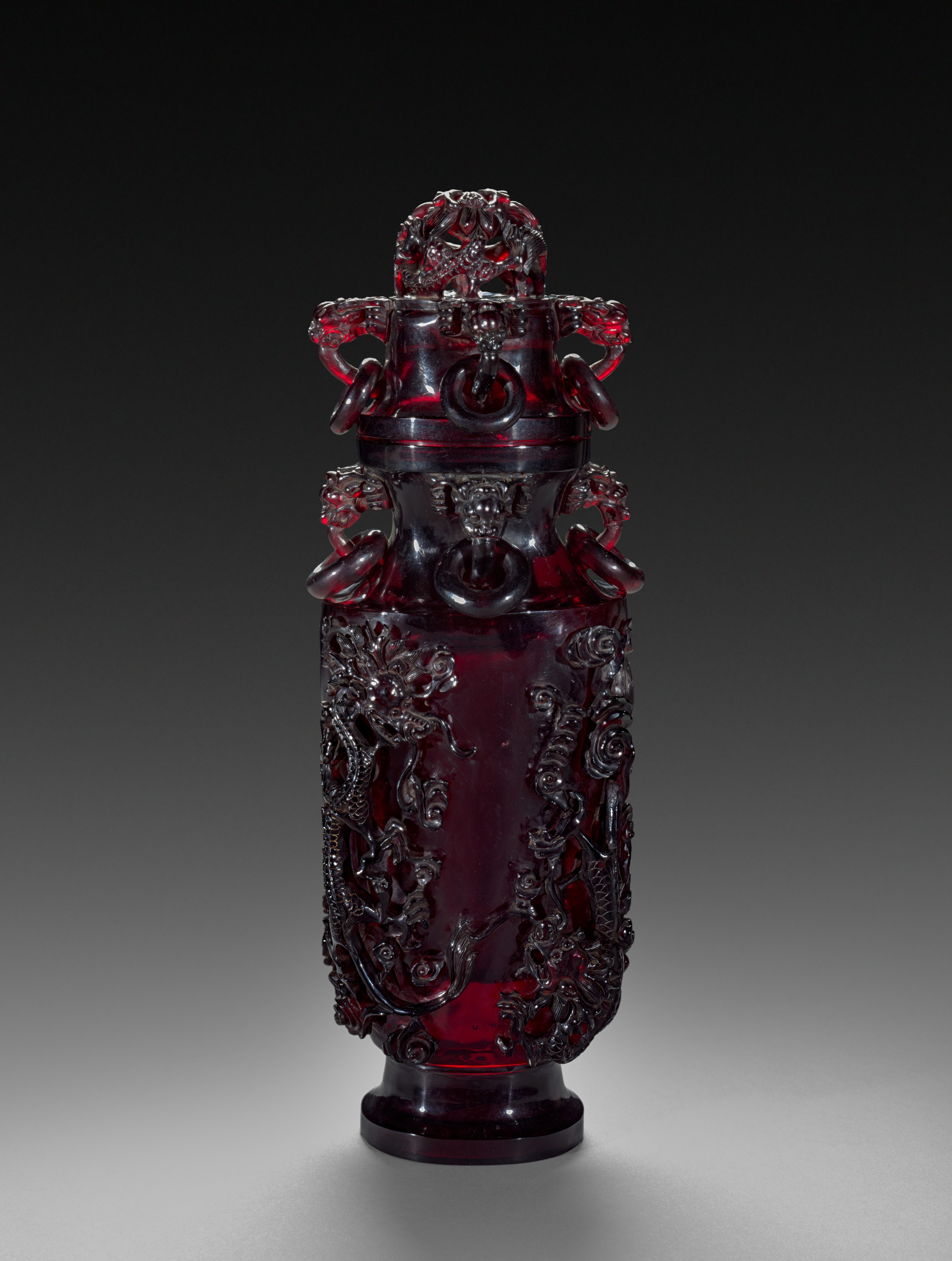 The artist's work, titled Vase, features a dark red, intricately carved vase. The vase has a cylindrical body with a narrow base that widens slightly at the bottom. A wide, flat base supports the vase. The vase's body is adorned with ornate carvings of flowers and foliage, which cover the entire surface. Two curved handles are positioned on either side of the vase's top. The handles are shaped like dragons. The lid is decorated with a carving resembling a dragon. The background of the image transitions from black at the top to gray at the bottom.