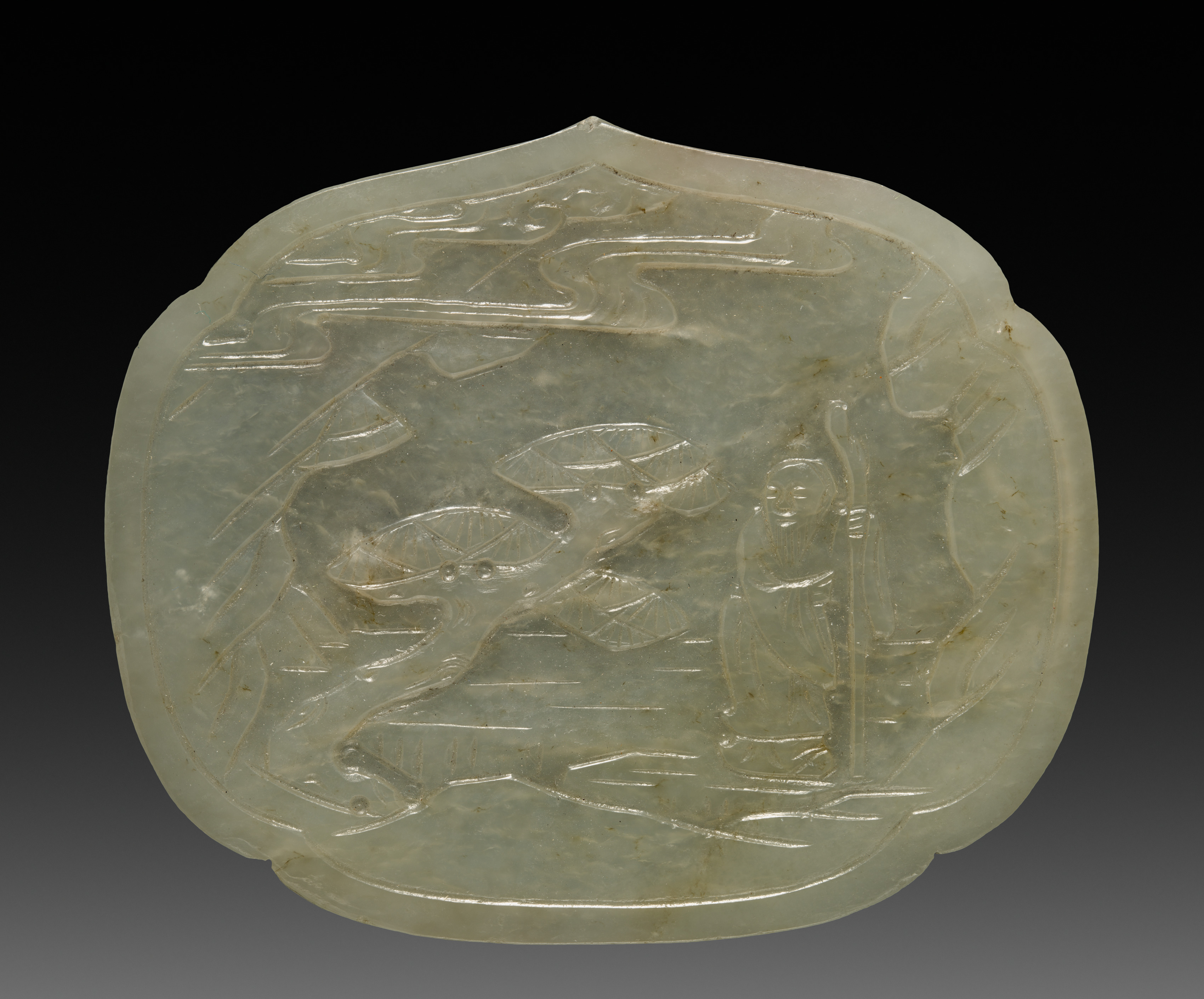 Pale green jade plaque with a rounded square shape and a pointed top. The plaque features an intricate carving of a man and a bird. The man is standing on the right side, wearing a long robe and holding a staff. The bird is on the left, with outstretched wings. The background of the plaque has a subtle design resembling foliage or water. The plaque appears to have a smooth, glossy finish. The background behind the plaque is black, transitioning to dark gray at the bottom.