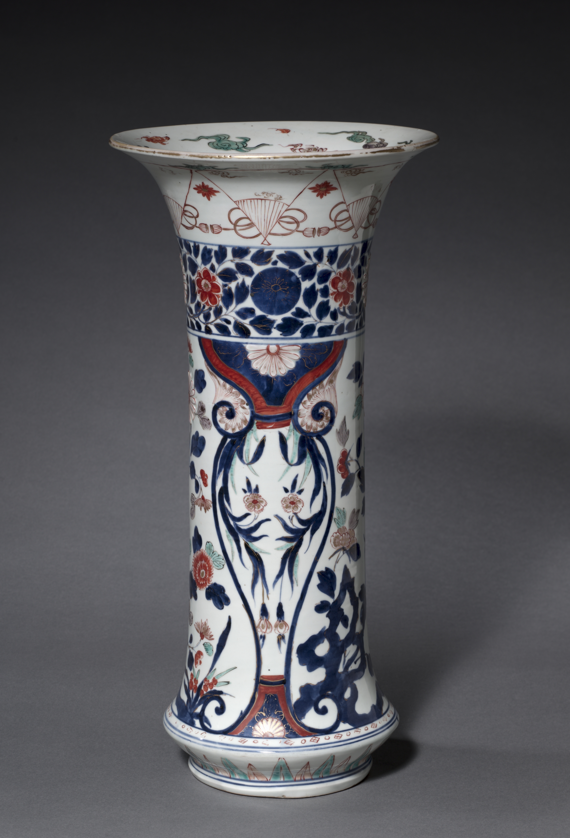White vase with a wide mouth and narrow base. The vase has a blue and red floral pattern with a band of blue flowers around the top. A red and blue design is underneath the band. The lower part of the vase has a large blue and white design with flowers and vines. The background of the image is dark gray. The overall style of the vase is reminiscent of traditional Asian art. The title of the piece is "Vase".