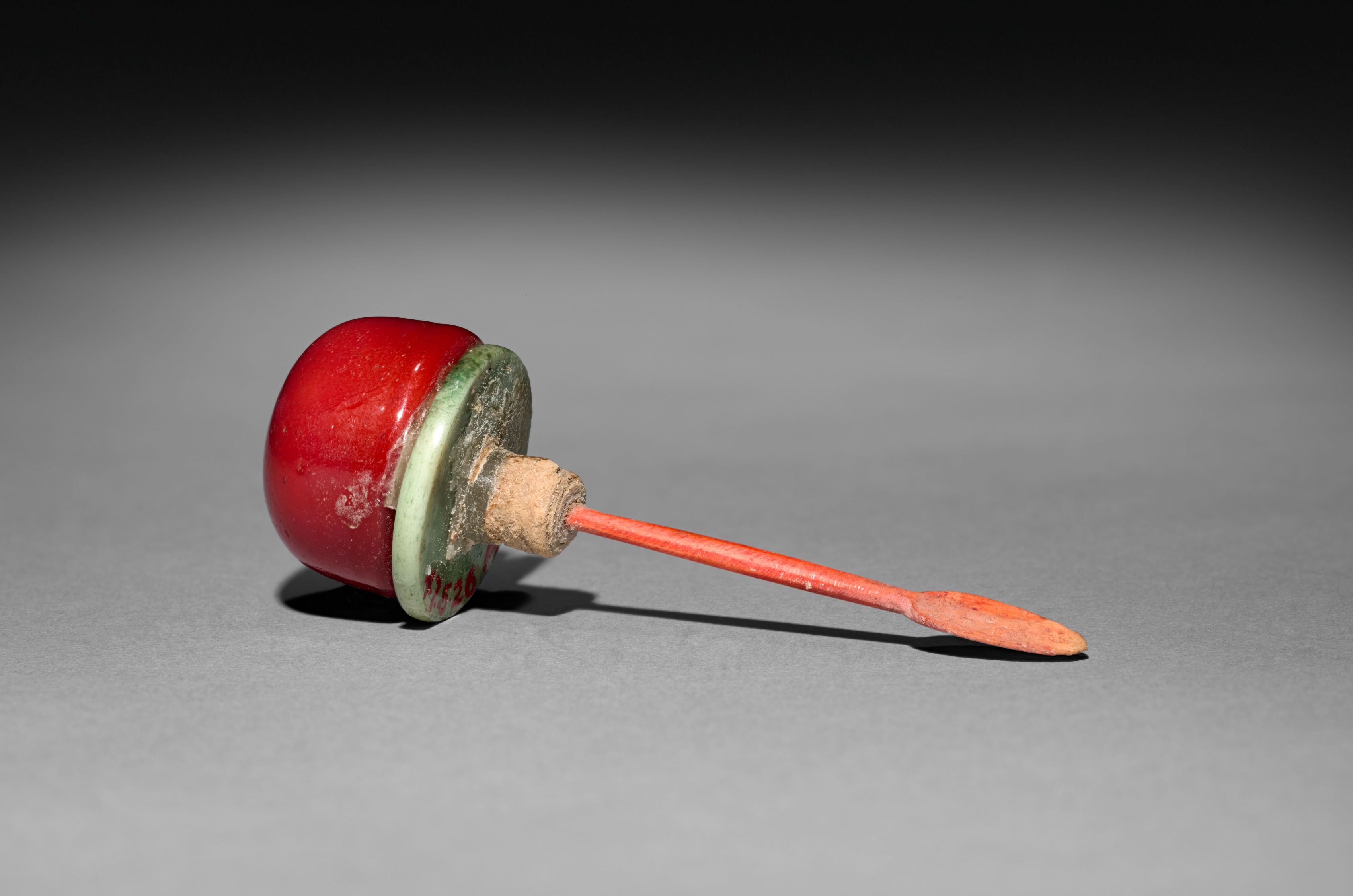 Red snuff bottle with stopper. The bottle is lying on its side, with the stopper pointing to the right. The bottle is red with a green rim. The stopper has a long orange stick attached to a tan cork. The cork is wedged into the green rim. The background is gray with a black vignette.