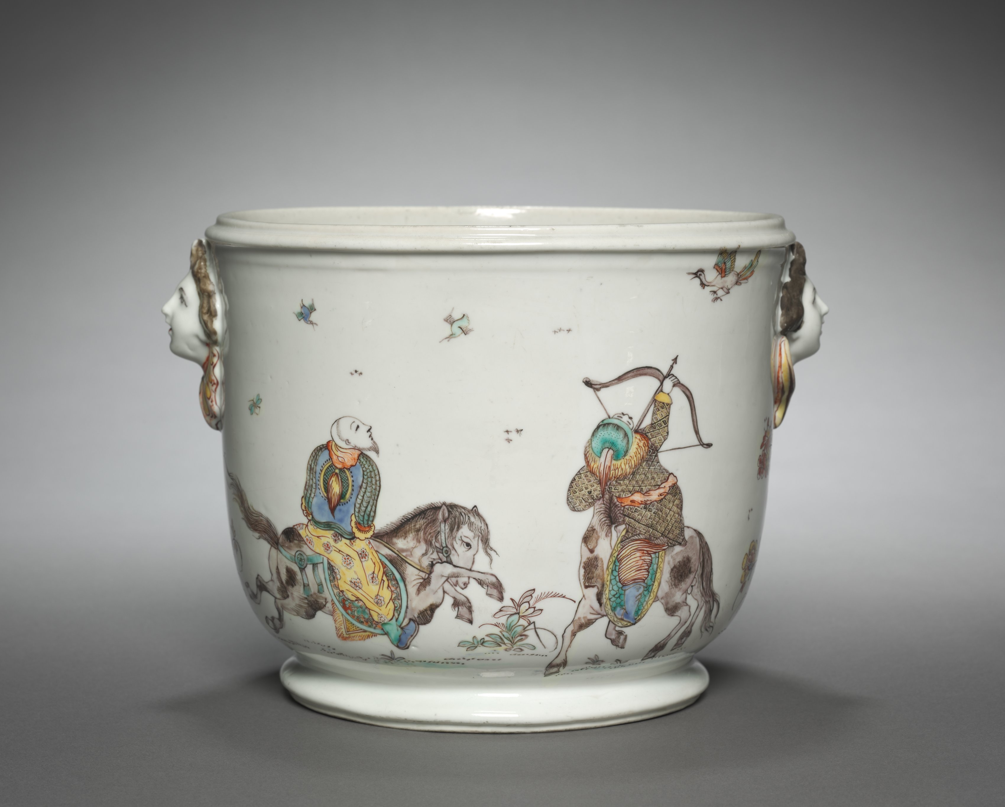 The image shows a white porcelain cooler with a wide mouth and a flat base. The cooler has two handles on either side, each featuring a human head with long hair. The body of the cooler features a colorful scene depicting two people on horseback; one person is holding a bow and arrow, while the other is sitting on a horse. The people and horses are surrounded by butterflies and flowers. The background of the image is a gradient of gray, transitioning from dark to light. The cooler is centered in the image, casting a shadow on the surface below it. The overall design and color scheme suggest an antique or vintage piece, specifically a bottle cooler, also known as a seau a bouteille, produced by the Mennecy- Villeroy Factory.