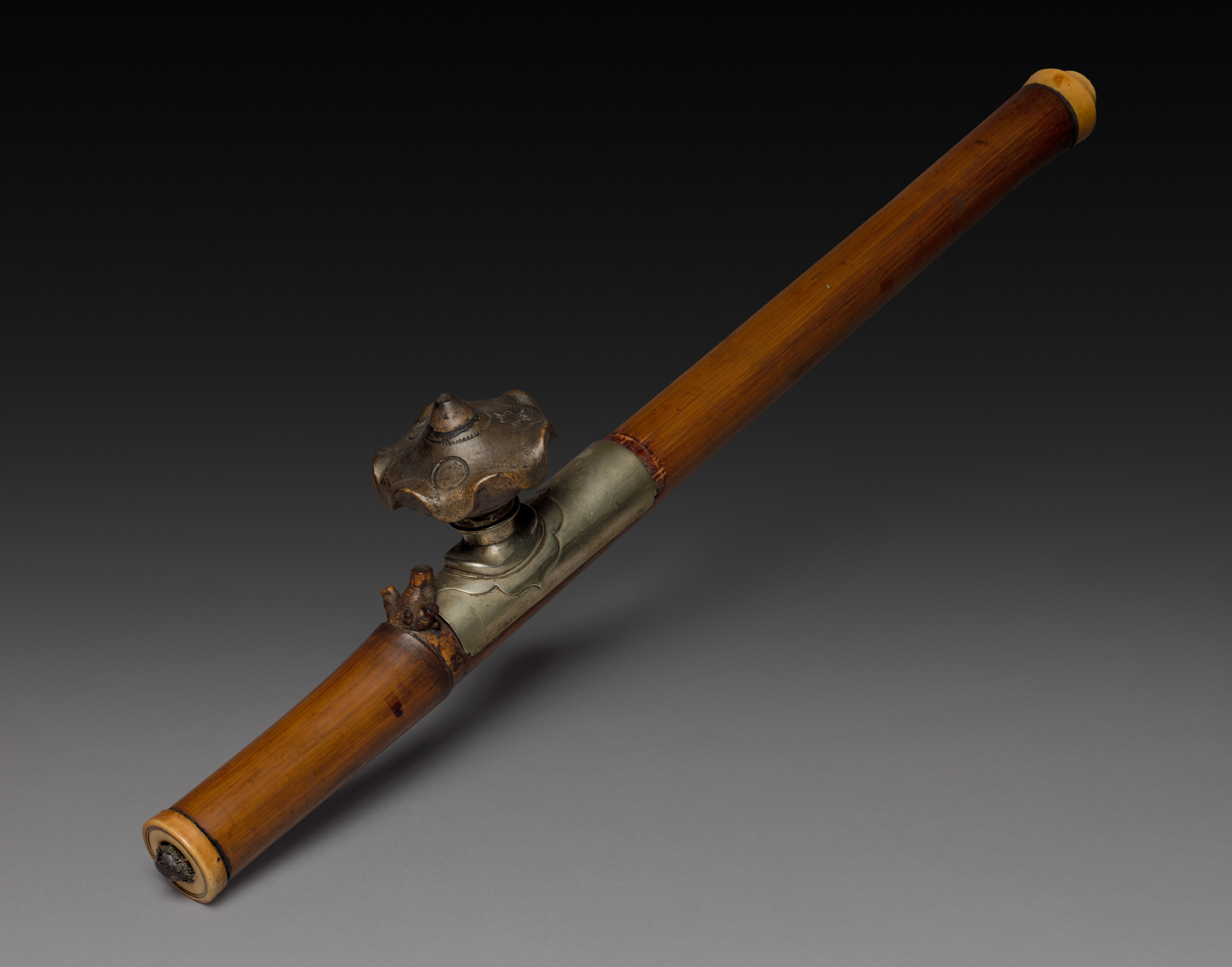 The image shows an opium pipe by artist unidentified. The pipe has a long, thin wooden stem with a metal bowl and mouthpiece. The bowl of the pipe features a carved design resembling a mythical creature or dragon's head. The stem of the pipe is made of wood and has a light-colored cap on the end. The mouthpiece of the pipe is also made of wood and has a small metal band around it. The background of the image is a gradient of black to gray. The pipe rests on a gray surface.