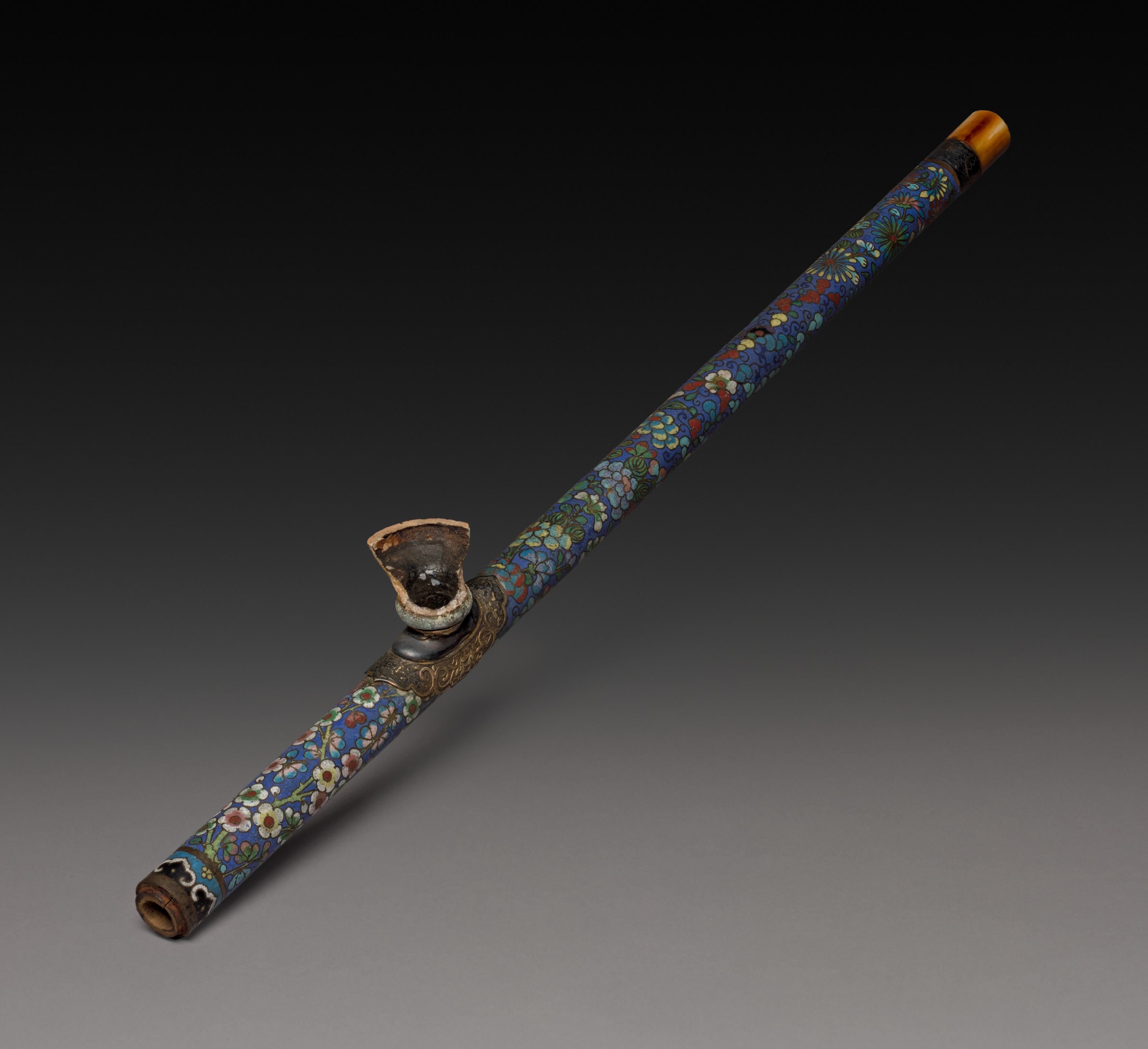 Long, thin, cylindrical object with floral pattern, titled "Opium Pipe" by artist. The object has a small bowl near the middle and a small opening at one end. The bowl is made of metal with a dark patina; it has a rounded shape with a wide mouth and a narrow base. The body of the object is covered in a mosaic pattern featuring small flowers and leaves in shades of blue, green, red, yellow, and white. The mosaic pattern extends to a gold-colored metal piece separating the bowl from the body. The end of the object has a gold cap. The background is a gradient from black at the top to gray at the bottom.